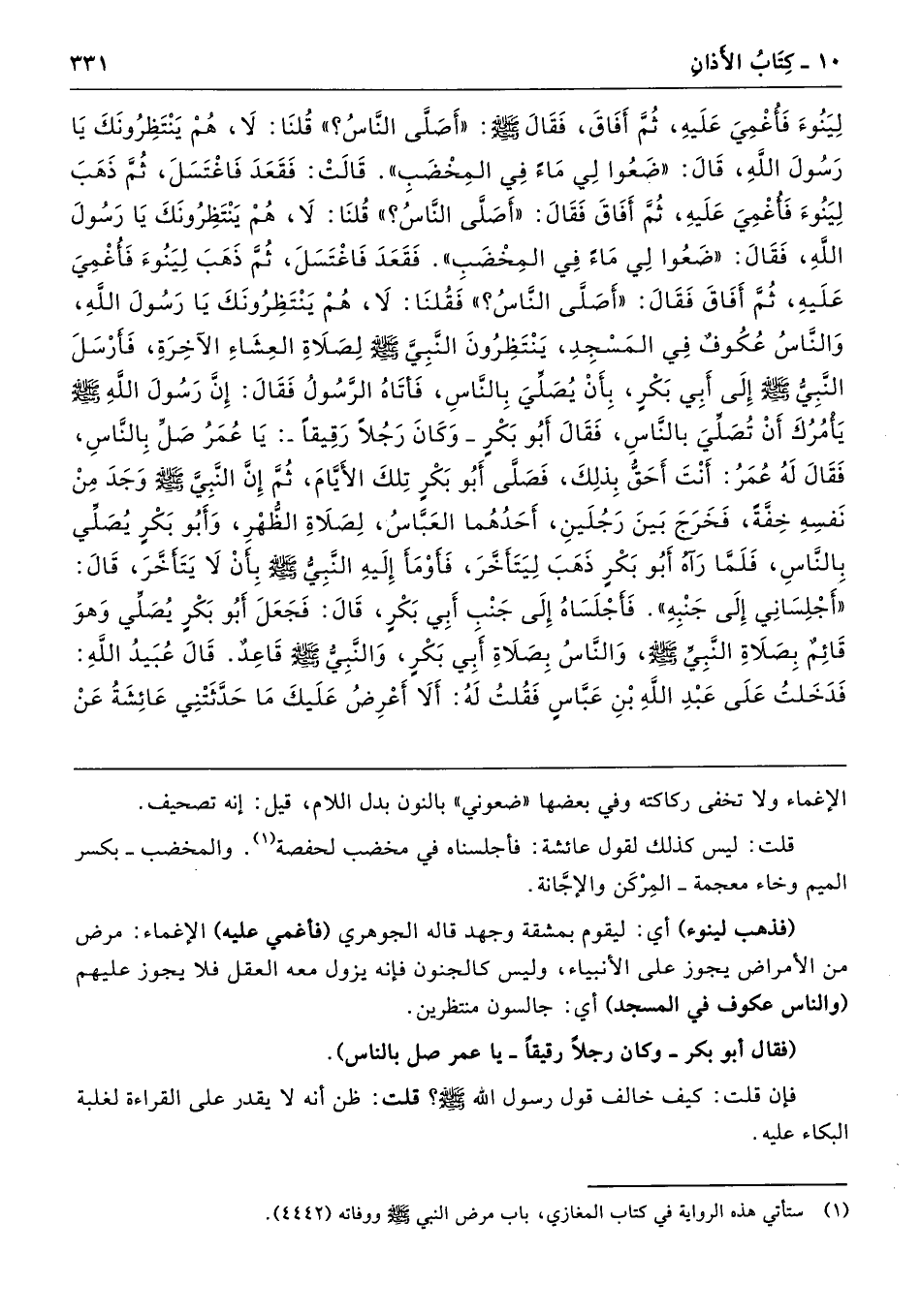 لِيَنُوءَ فَأُغْمِىَ عَلَيْهِ، ثُمَّ أَفَاقَ فَقَالَ - صلى الله عليه وسلم - «أَصَلَّى النَّاسُ». قُلْنَا لاَ، هُمْ يَنْتَظِرُونَكَ يَا رَسُولَ اللَّهِ. قَالَ «ضَعُوا لِى مَاءً فِي الْمِخْضَبِ». قَالَتْ فَقَعَدَ فَاغْتَسَلَ، ثُمَّ ذَهَبَ لِيَنُوءَ فَأُغْمِىَ عَلَيْهِ، ثُمَّ أَفَاقَ فَقَالَ «أَصَلَّى النَّاسُ». قُلْنَا لاَ، هُمْ يَنْتَظِرُونَكَ يَا رَسُولَ اللَّهِ. فَقَالَ «ضَعُوا لِى مَاءً فِي الْمِخْضَبِ»، فَقَعَدَ فَاغْتَسَلَ، ثُمَّ ذَهَبَ لِيَنُوءَ فَأُغْمِىَ عَلَيْهِ، ثُمَّ أَفَاقَ فَقَالَ «أَصَلَّى النَّاسُ». فَقُلْنَا لاَ، هُمْ يَنْتَظِرُونَكَ يَا رَسُولَ اللَّهِ - وَالنَّاسُ عُكُوفٌ فِي الْمَسْجِدِ يَنْتَظِرُونَ النَّبِىَّ عَلَيْهِ السَّلاَمُ لِصَلاَةِ الْعِشَاءِ الآخِرَةِ - فَأَرْسَلَ النَّبِىُّ - صلى الله عليه وسلم - إِلَى أَبِى بَكْرٍ بِأَنْ يُصَلِّىَ بِالنَّاسِ، فَأَتَاهُ الرَّسُولُ فَقَالَ إِنَّ رَسُولَ اللَّهِ - صلى الله عليه وسلم - يَأْمُرُكَ أَنْ تُصَلِّىَ بِالنَّاسِ. فَقَالَ أَبُو بَكْرٍ - وَكَانَ رَجُلاً رَقِيقًا - يَا عُمَرُ صَلِّ بِالنَّاسِ. فَقَالَ لَهُ عُمَرُ أَنْتَ أَحَقُّ بِذَلِكَ. فَصَلَّى أَبُو بَكْرٍ تِلْكَ الأَيَّامَ، ثُمَّ إِنَّ النَّبِىَّ - صلى الله عليه وسلم - وَجَدَ مِنْ نَفْسِهِ خِفَّةً فَخَرَجَ بَيْنَ رَجُلَيْنِ أَحَدُهُمَا الْعَبَّاسُ لِصَلاَةِ الظُّهْرِ، وَأَبُو بَكْرٍ يُصَلِّى بِالنَّاسِ، فَلَمَّا رَآهُ أَبُو بَكْرٍ ذَهَبَ لِيَتَأَخَّرَ فَأَوْمَأَ إِلَيْهِ النَّبِىُّ - صلى الله عليه وسلم - بِأَنْ لاَ يَتَأَخَّرَ. قَالَ «أَجْلِسَانِى إِلَى جَنْبِهِ». فَأَجْلَسَاهُ إِلَى جَنْبِ أَبِى بَكْرٍ. قَالَ فَجَعَلَ أَبُو بَكْرٍ يُصَلِّى وَهْوَ يَأْتَمُّ بِصَلاَةِ النَّبِيِّ - صلى الله عليه وسلم - وَالنَّاسُ بِصَلاَةِ أَبِى بَكْرٍ، وَالنَّبِىُّ - صلى الله عليه وسلم - قَاعِدٌ. قَالَ عُبَيْدُ اللَّهِ فَدَخَلْتُ عَلَى عَبْدِ اللَّهِ بْنِ عَبَّاسٍ فَقُلْتُ لَهُ أَلاَ أَعْرِضُ عَلَيْكَ مَا حَدَّثَتْنِى عَائِشَةُ عَنْ