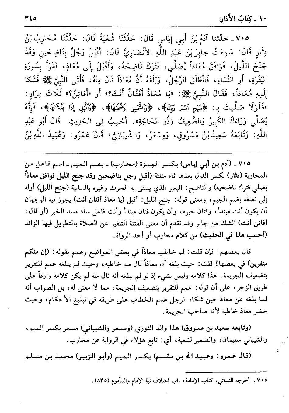 705 - (آدم بن أبي إياس) بكسر الهمزة (محارب) -بضم الميم- اسم فاعل من المحاربة (دثار) بكسر الدال بعدها ثاء مثلثة (أقبل رجل بناضحين وقد جنح الليل فوافق معاذًا يصلي فترك ناضحيه) والناضح: البعير الذي يسقى به الحرث وغيره بالسانية (جنح الليل) أوله إلى نصفه بضم الجيم، ومعنى قوله: جنح الليل: أقبل (يا معاذ أفتان أنت) يجوز فيه الوجهان أن يكون أنت مبتدأ، وفتان خبره، وأن يكون فتان مبتدأ وأنت فاعل ساد مسد الخبر (أو قال: أفاتن أنت) الشك من جابر وقد تقدم أن معنى الفتنة التنفير عن الصلاة بالتطويل فيها الزائد (أحسب هذا في الحديث) من كلام محارب أو أحد الرواة.