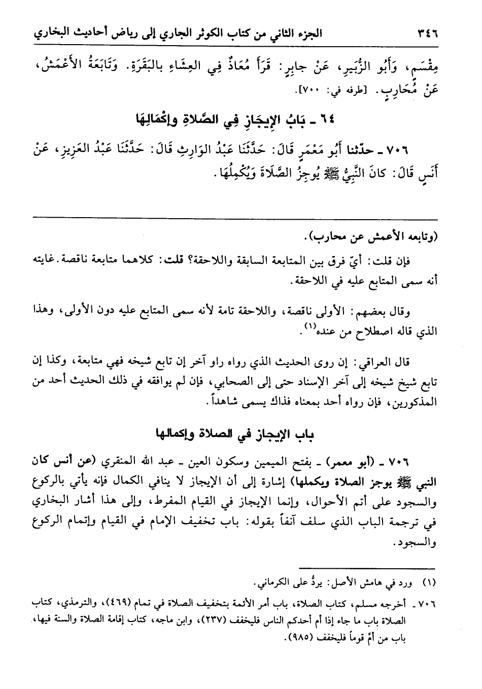 706 - (أبو معمر) -بفتح الميمين وسكون العين- عبد الله المنقري (عن أنس كان النبي -صلى الله عليه وسلم- يوجز الصلاة ويكملها) إشارة إلى أن الإيجاز لا ينافي الكمال فإنَّه يأتي بالركوع والسجود على أتم الأحوال، وإنما الإيجاز في القيام المفرط، وإلى هذا أشار البخاري في ترجمة الباب الذي سلف آنفًا بقوله: باب تخفيف الإمام في القيام وإتمام الركوع والسجود.