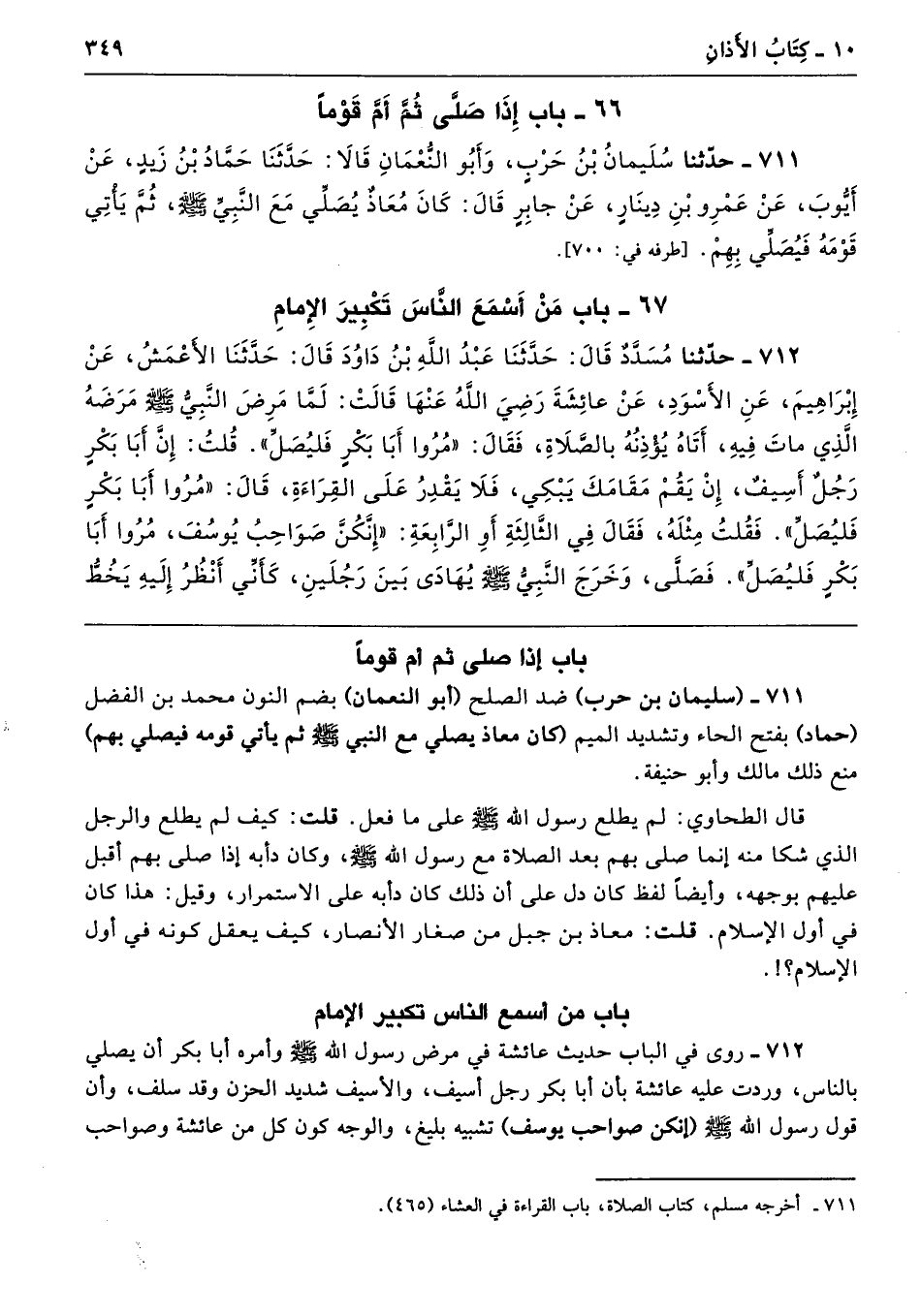 712 - روى في الباب حديث عائشة في مرض رسول الله -صلى الله عليه وسلم- وأمره أبا بكر أن يصلي بالناس، وردت عليه عائشة بأن أبا بكر رجل أسيف، والأسيف شديد الحزن وقد سلف، وأن قول رسول الله -صلى الله عليه وسلم- (إنكن صواحب يوسف) تشبيه بليغ، والوجه كون كل من عائشة وصواحب