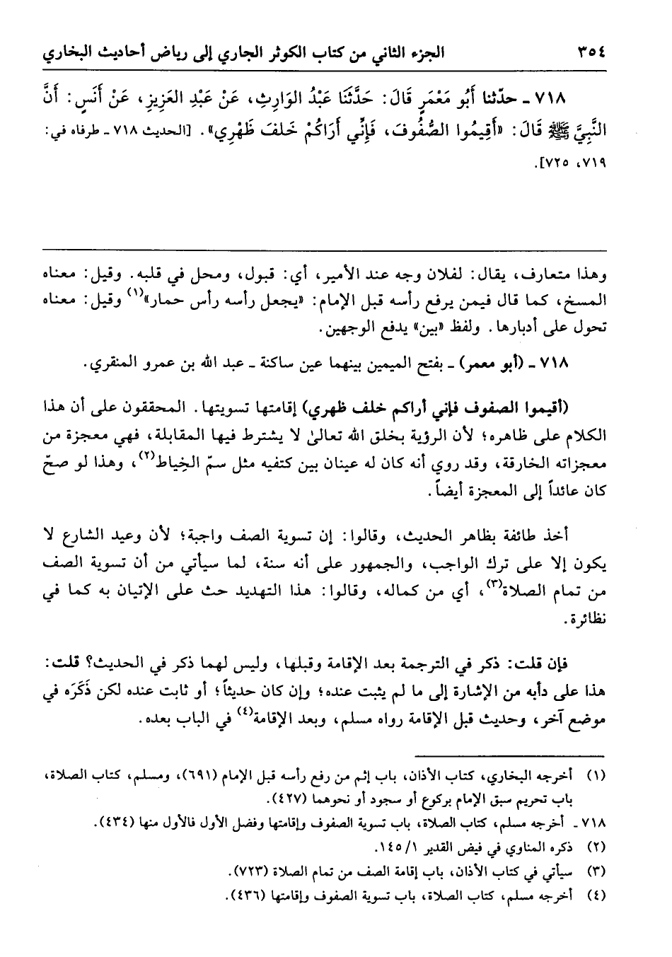 718 - حَدَّثَنَا أَبُو مَعْمَرٍ قَالَ حَدَّثَنَا عَبْدُ الْوَارِثِ عَنْ عَبْدِ الْعَزِيزِ عَنْ أَنَسٍ أَنَّ النَّبِىَّ - صلى الله عليه وسلم - قَالَ «أَقِيمُوا الصُّفُوفَ فَإِنِّى أَرَاكُمْ خَلْفَ ظَهْرِى». طرفاه 719، 725