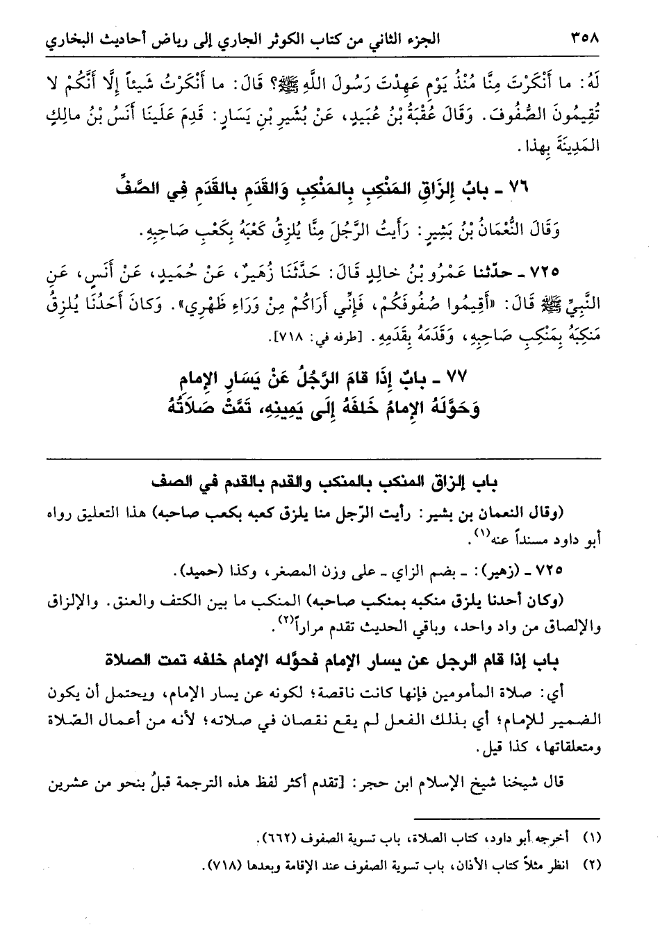 (وقال النعمان بن بشير: رأيت الرجل منا يلزق كعبه بكعب صاحبه) هذا التعليق رواه أبو داود مسندًا عنه.