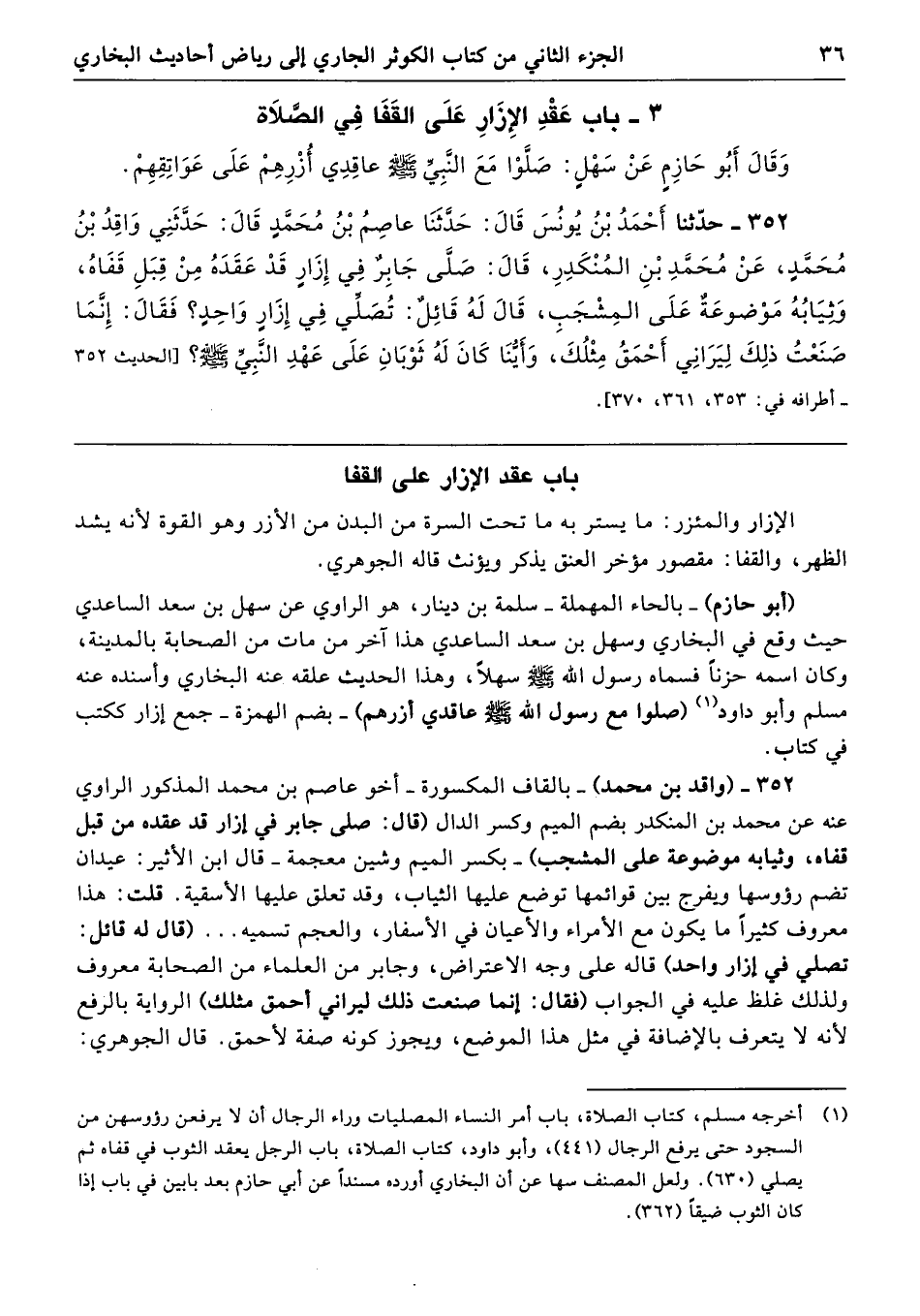 352 - (واقد بن محمَّد) -بالقاف المكسورة- أخو عاصم بن محمَّد المذكور الراوي عنه عن محمَّد بن المنكدر بضم الميم وكسر الدال (قال: صلى جابر في إزار قد عقده من قبل قفاه، وثيابه موضوعة على المشجب) -بكسر الميم وستين معجمة- قال ابن الأثير: عيدان تضم رؤوسها ويفرج بين قوائمها توضع عليها الثياب، وقد تعلق عليها الأسقية. قلت: هذا معروف كثيرًا ما يكون مع الأمراء والأعيان في الأسفار، والعجم تسميه ... (قال له قائل: تصلي في إزار واحد) قاله على وجه الاعتراض، وجابر من العلماء من الصَّحَابَة معروف ولذلك غلظ عليه في الجواب (فقال: إنما صنعت ذلك ليراني أحمق مثلك) الرواية بالرفع لأنه لا يتعرف بالإضافة في مثل هذا الموضع، ويجوز كونه صفة لأحمق. قال الجوهري: