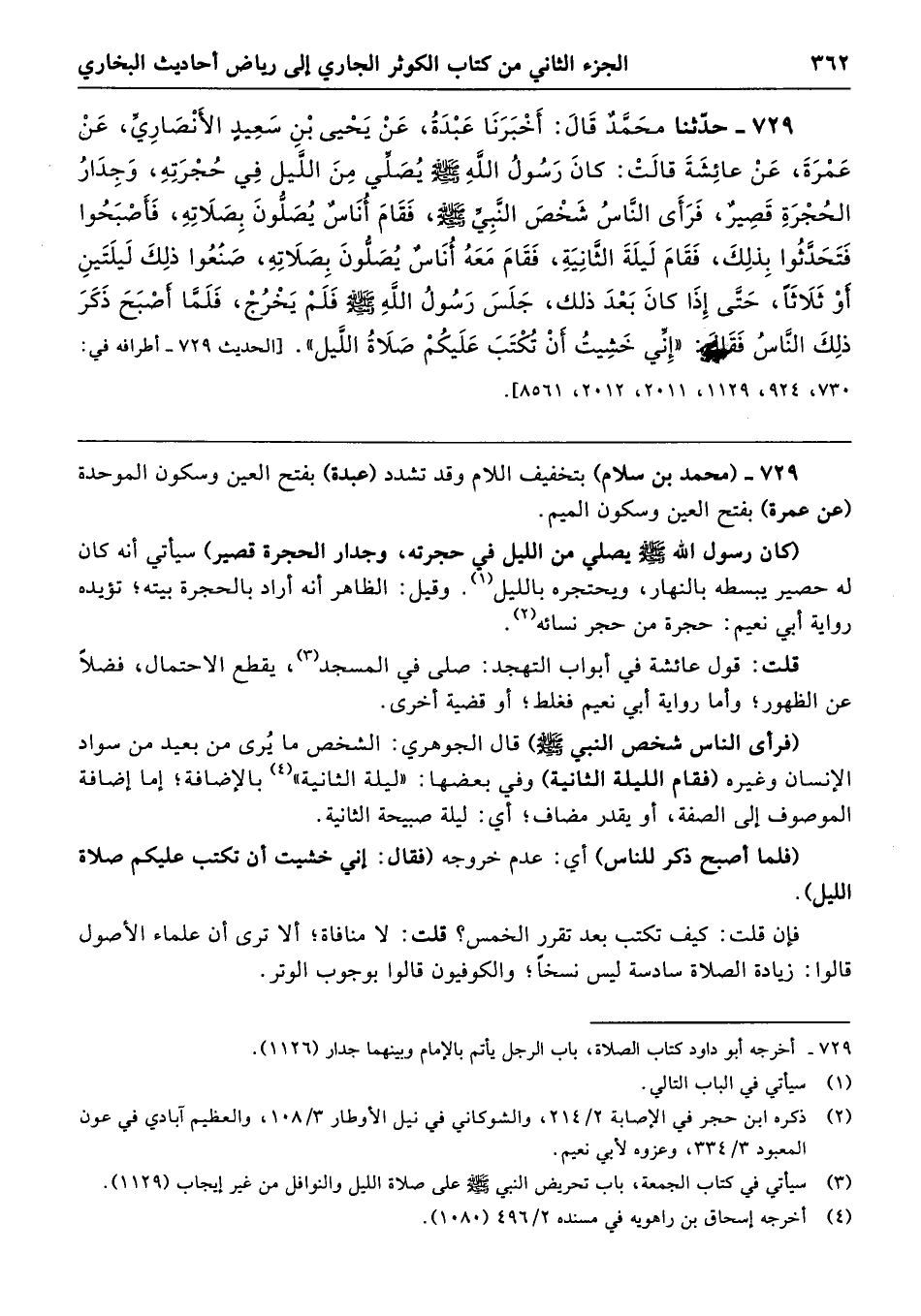 729 - حَدَّثَنَا مُحَمَّدٌ قَالَ أَخْبَرَنَا عَبْدَةُ عَنْ يَحْيَى بْنِ سَعِيدٍ الأَنْصَارِىِّ عَنْ عَمْرَةَ عَنْ عَائِشَةَ قَالَتْ كَانَ رَسُولُ اللَّهِ - صلى الله عليه وسلم - يُصَلِّى مِنَ اللَّيْلِ فِي حُجْرَتِهِ، وَجِدَارُ الْحُجْرَةِ قَصِيرٌ، فَرَأَى النَّاسُ شَخْصَ النَّبِيِّ - صلى الله عليه وسلم - فَقَامَ أُنَاسٌ يُصَلُّونَ بِصَلاَتِهِ، فَأَصْبَحُوا فَتَحَدَّثُوا بِذَلِكَ، فَقَامَ لَيْلَةَ الثَّانِيَةِ، فَقَامَ مَعَهُ أُنَاسٌ يُصَلُّونَ بِصَلاَتِهِ، صَنَعُوا ذَلِكَ لَيْلَتَيْنِ أَوْ ثَلاَثَةً، حَتَّى إِذَا كَانَ بَعْدَ ذَلِكَ جَلَسَ رَسُولُ اللَّهِ - صلى الله عليه وسلم - فَلَمْ يَخْرُجْ، فَلَمَّا أَصْبَحَ ذَكَرَ ذَلِكَ النَّاسُ فَقَالَ «إِنِّى خَشِيتُ أَنْ تُكْتَبَ عَلَيْكُمْ صَلاَةُ اللَّيْلِ». أطرافه 730، 924، 1129، 2011، 2012، 8561