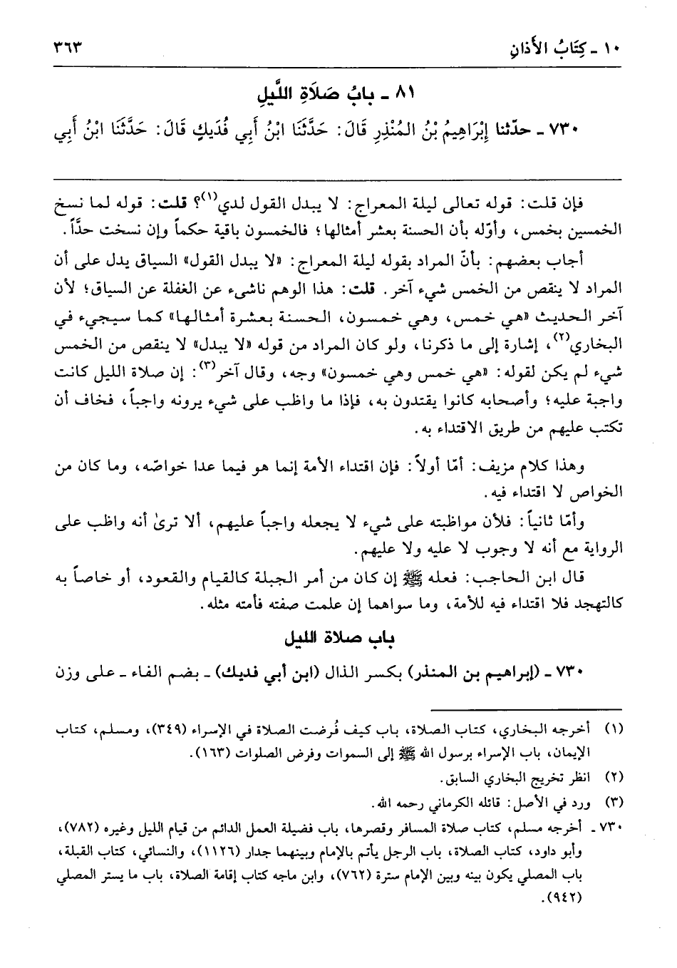 730 - (إبراهيم بن المنذر) بكسر الذال (ابن أبي فديك) -بضم الفاء- على وزن