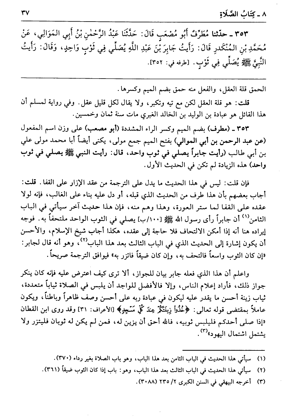 353 - (مطرف) بضم الميم وكسر الراء المشددة (أبو مصعب) على وزن اسم المفعول (عن عبد الرَّحْمَن بن أبي الموالي) بفتح الميم جمع مولى، يكنى أَيضًا أَبا محمَّد مولى علي بن أبي طالب (رأيت جابرًا يصلي في ثوب واحد، قال: رأيت النَّبِيّ - صلى الله عليه وسلم - يصلي في ثوب واحد) هذه الزيادة لم تكن في الحديث الأول.