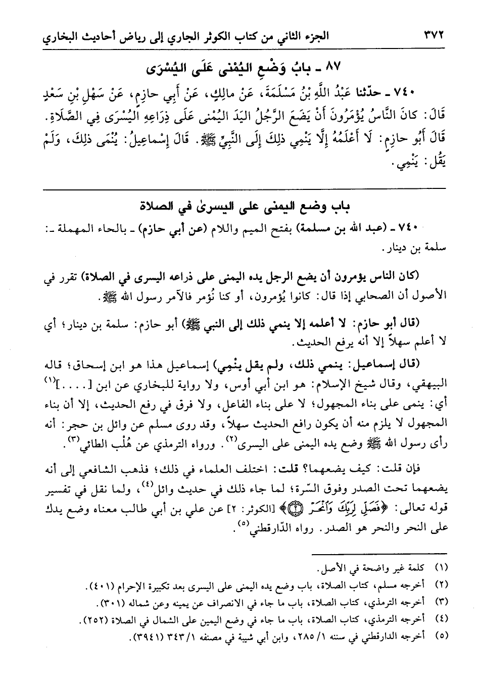 (كان الناس يؤمرون أن يضع الرجل يده اليمنى على ذراعه اليسرى في الصلاة) تقرر في الأصول أن الصحابي إذا قال: كانوا يُؤمرون، أو كنا نُؤمر فالآمر رسول الله - صلى الله عليه وسلم -.