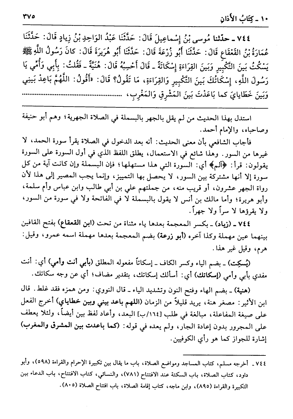 744 - حَدَّثَنَا مُوسَى بْنُ إِسْمَاعِيلَ قَالَ حَدَّثَنَا عَبْدُ الْوَاحِدِ بْنُ زِيَادٍ قَالَ حَدَّثَنَا عُمَارَةُ بْنُ الْقَعْقَاعِ قَالَ حَدَّثَنَا أَبُو زُرْعَةَ قَالَ حَدَّثَنَا أَبُو هُرَيْرَةَ قَالَ كَانَ رَسُولُ اللَّهِ - صلى الله عليه وسلم - يَسْكُتُ بَيْنَ التَّكْبِيرِ وَبَيْنَ الْقِرَاءَةِ إِسْكَاتَةً - قَالَ أَحْسِبُهُ قَالَ هُنَيَّةً - فَقُلْتُ بِأَبِى وَأُمِّى يَا رَسُولَ اللَّهِ، إِسْكَاتُكَ بَيْنَ التَّكْبِيرِ وَالْقِرَاءَةِ مَا تَقُولُ قَالَ «أَقُولُ اللَّهُمَّ بَاعِدْ بَيْنِى وَبَيْنَ خَطَايَاىَ كَمَا بَاعَدْتَ بَيْنَ الْمَشْرِقِ وَالْمَغْرِبِ،