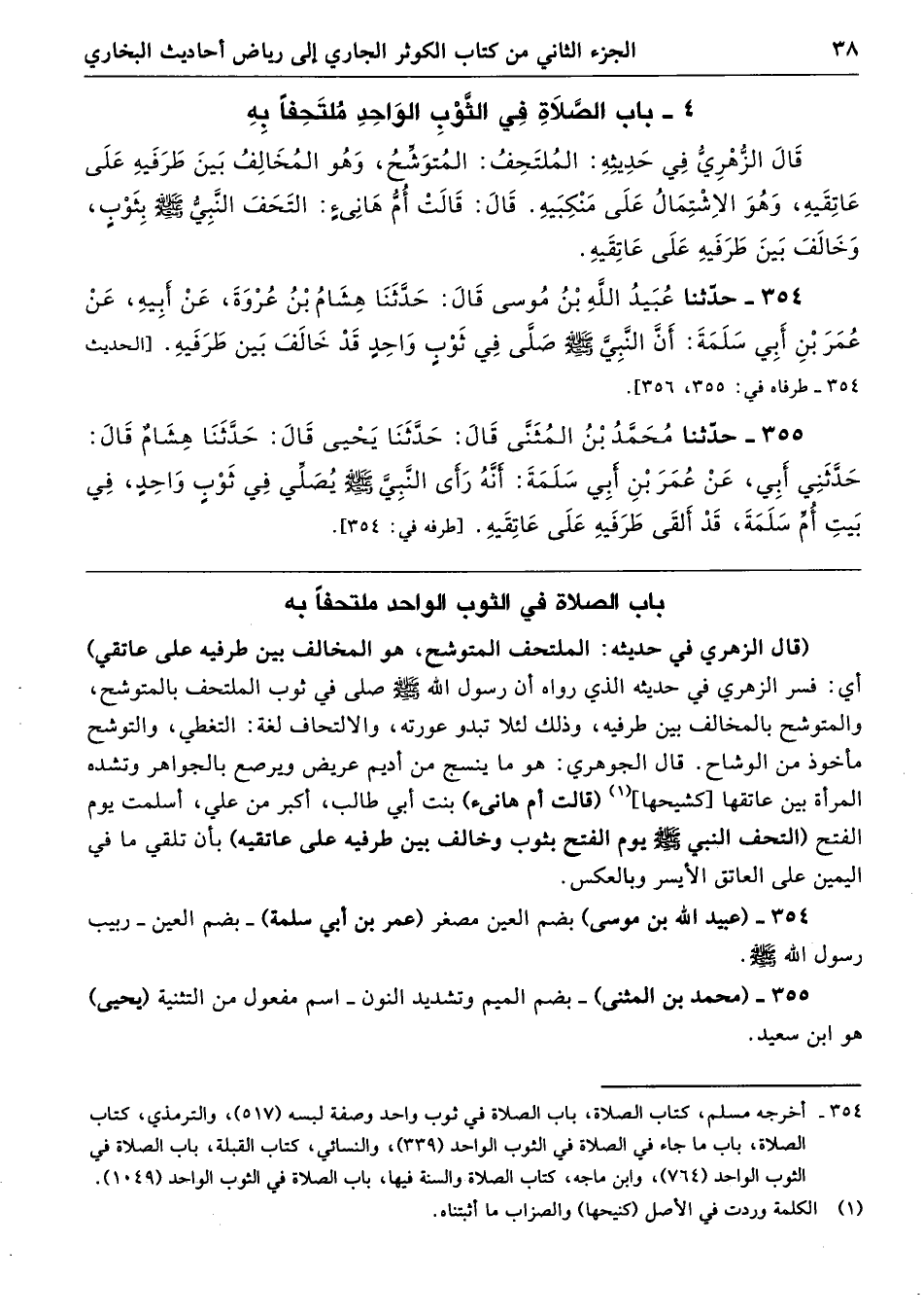(قال الزُّهْرِيّ في حديثه: الملتحف المتوشح، هو المخالف بين طرفيه على عاتقي) أي: فسر الزُّهْرِيّ في حديثه الذي رواه أن رسول الله -صلى الله عليه وسلم- صلى في ثوب الملتحف بالمتوشح، والمتوشح بالمخالف بين طرفيه، وذلك لئلا تبدو عورته، والالتحاف لغة: التغطي، والتوشح مأخوذ من الوشاح. قال الجوهري: هو ما ينسج من أديم عريض ويرصع بالجواهر وتشده المرأة بين عاتقها [كشيحها] (قالت أم هانئ) بنت أبي طالب، أكبر من علي، أسلمت يوم الفتح (التحف النَّبِيّ - صلى الله عليه وسلم - يوم الفتح بثوب وخالف بين طرفيه على عاتقيه) بأن تلقي ما في اليمين على العاتق الأيسر وبالعكس.