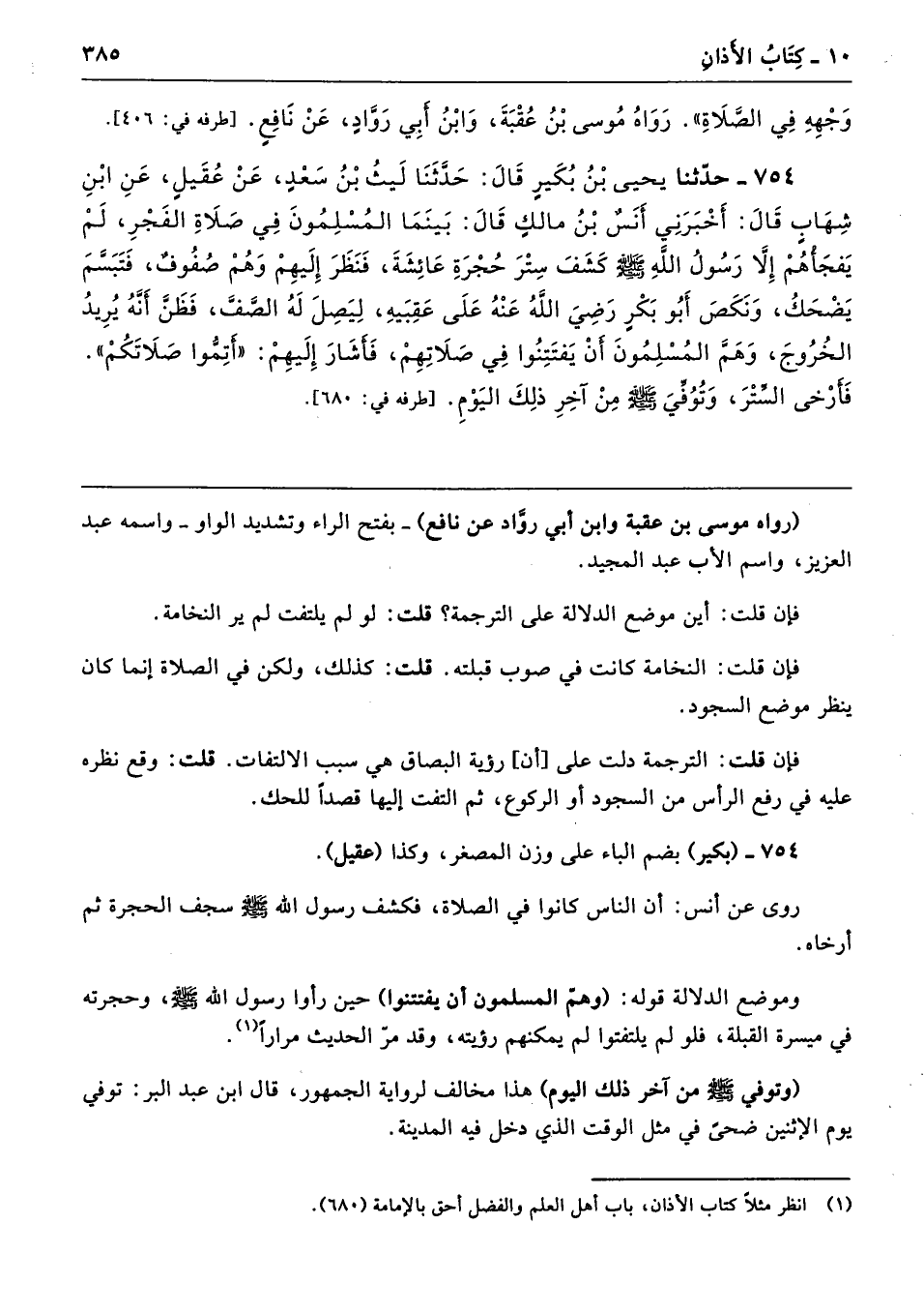 754 - حَدَّثَنَا يَحْيَى بْنُ بُكَيْرٍ قَالَ حَدَّثَنَا لَيْثُ بْنُ سَعْدٍ عَنْ عُقَيْلٍ عَنِ ابْنِ شِهَابٍ قَالَ أَخْبَرَنِى أَنَسٌ قَالَ بَيْنَمَا الْمُسْلِمُونَ فِي صَلاَةِ الْفَجْرِ لَمْ يَفْجَأْهُمْ إِلاَّ رَسُولُ اللَّهِ - صلى الله عليه وسلم - كَشَفَ سِتْرَ حُجْرَةِ عَائِشَةَ فَنَظَرَ إِلَيْهِمْ وَهُمْ صُفُوفٌ، فَتَبَسَّمَ يَضْحَكُ، وَنَكَصَ أَبُو بَكْرٍ رضى الله عنه عَلَى عَقِبَيْهِ لِيَصِلَ لَهُ الصَّفَّ فَظَنَّ أَنَّهُ يُرِيدُ الْخُرُوجَ، وَهَمَّ الْمُسْلِمُونَ أَنْ يَفْتَتِنُوا فِي صَلاَتِهِمْ، فَأَشَارَ إِلَيْهِمْ أَتِمُّوا صَلاَتَكُمْ، فَأَرْخَى السِّتْرَ، وَتُوُفِّىَ مِنْ آخِرِ ذَلِكَ الْيَوْمِ. طرفه 680