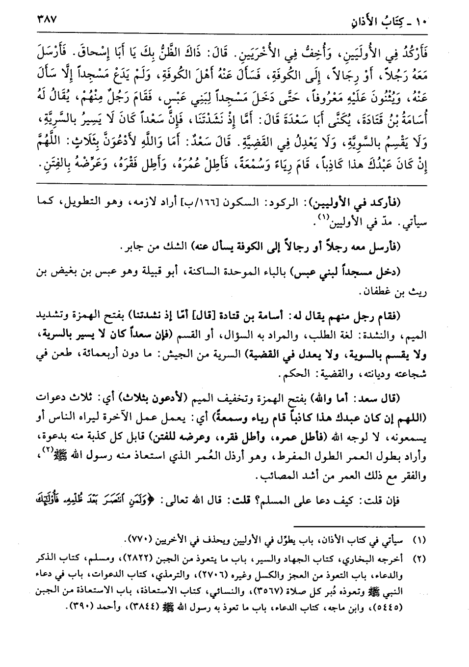 (قال سعد: أما والله) بفتح الهمزة وتخفيف الميم (لأدعون بثلاث) أي: ثلاث دعوات (اللهم إن كان عبدك هذا كاذبًا قام رياء وسمعةً) أي: يعمل عمل الآخرة ليراه الناس أو يسمعونه، لا لوجه الله (فأطل عمره، وأطل فقره، وعرضه للفتن) قابل كل كذبة منه بدعوة، وأراد بطول العمر الطول المفرط، وهو أرذل العُمر الذي استعاذ منه رسول الله - صلى الله عليه وسلم -، والفقر مع ذلك العمر من أشد المصائب.