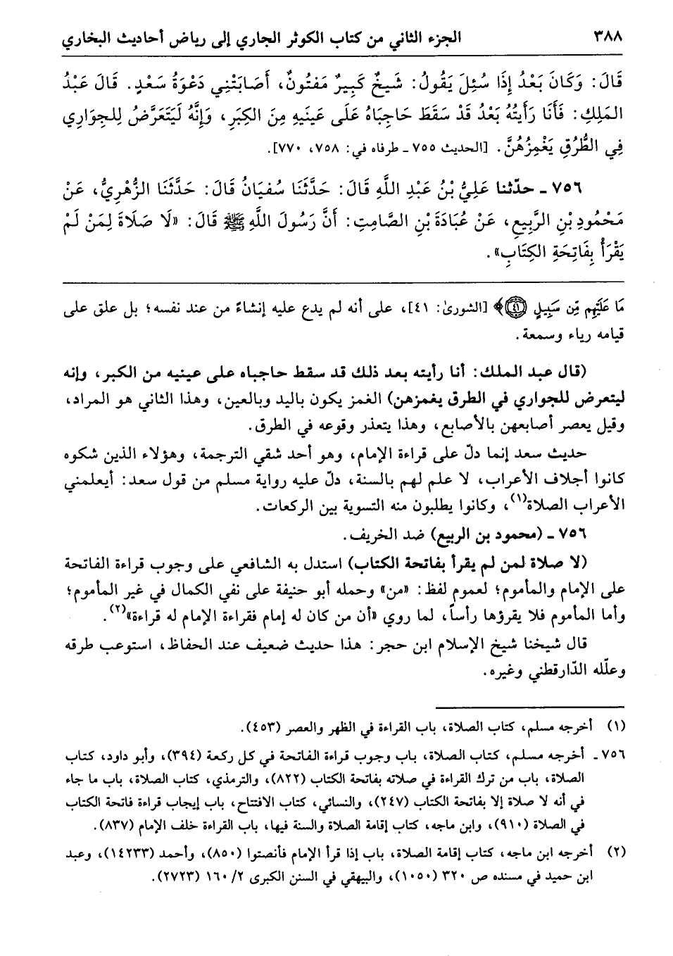 (لا صلاة لمن لم يقرأ بفاتحة الكتاب) استدل به الشافعي على وجوب قراءة الفاتحة على الإمام والمأموم؛ لعمومِ لفظ: "من" وحمله أبو حنيفة على نفي الكمال في غير المأموم؛ وأما المأموم فلا يقرؤها رأسًا، لما روي "أن من كان له إمام فقراءة الإمام له قراءة".