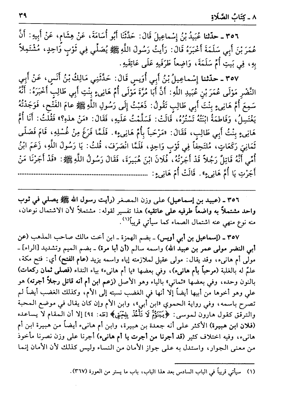 357 - (إسماعيل بن أبي أويس) -بضم الهمزة- ابن أخت مالك صاحب المذهب (عن أبي النضر مولى عمر بن عبيد الله) واسمه سالم (أن أَبا مرة) -بضم الميم وتشديد [الراء]- مولى أم هانئ، وقد يقال: مولى عقيل لملازمته إياه واسمه يزيد (عام الفتح) أي: فتح مكة، علم له بالغلبة (مرحبًا بأم هانئ)، وفي بعضها "يَا أم هانئ" بياء النداء (فصلى ثمان ركعات) بالنُّون وحده، وفي بعضها "ثماني" بالياء وهو الأصل (زعم ابن أم أنَّه قاتل رجلًا أجرته) هو علي وهو أخوها من أبيها أَيضًا إلَّا أنها في الغضب نسبته إلى الأم، وكذلك الغضب أَيضًا تصرح باسمه، وفي رواية الحموي "ابن أبي"، وابن الأم وإن كان يقال في موضع المحبة والترقق كقول هارون لموسى: {يَبْنَؤُمَّ لَا تَأْخُذْ بِلِحْيَتِي} [طه: 94] إلَّا أن المقام لا يساعده (فلان ابن هبيرة) الأكثر على أنَّه جعدة بن هبيرة، وابن أم هانئ أَيضًا من هبيرة ابن أم هانئ، وفيه اختلاف كثير (قد أجرنا من أجرت يَا أم هانئ) أجرنا على وزن نصرنا مأخوذ من معنى الجوار، واستدل به على جواز الأمان من النساء وليس كذلك لأن الأمان إنما