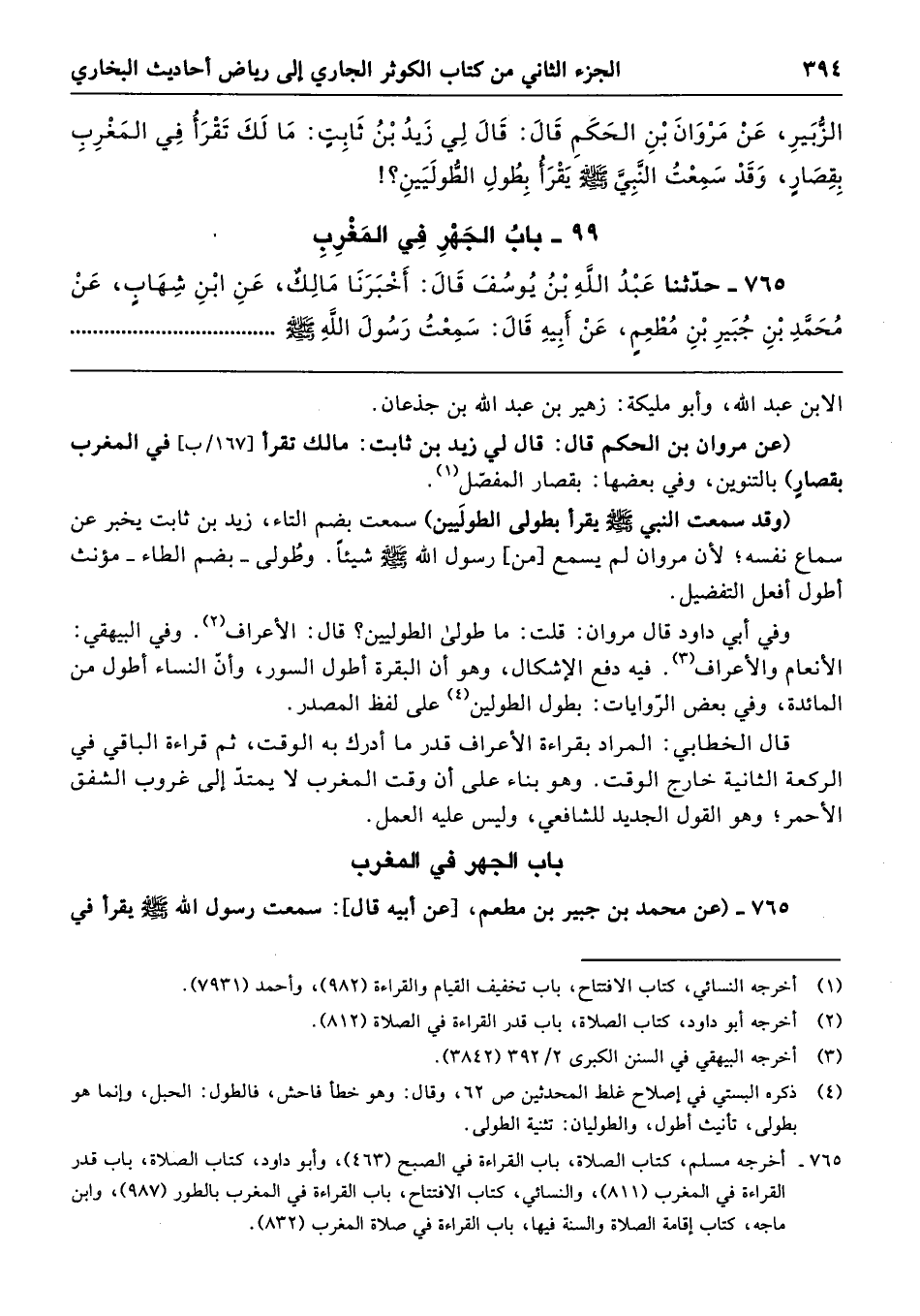 الزُّبَيْرِ عَنْ مَرْوَانَ بْنِ الْحَكَمِ قَالَ قَالَ لِى زَيْدُ بْنُ ثَابِتٍ مَا لَكَ تَقْرَأُ فِي الْمَغْرِبِ بِقِصَارٍ، وَقَدْ سَمِعْتُ النَّبِىَّ - صلى الله عليه وسلم - يَقْرَأُ بِطُولِ الطُّولَيَيْنِ؟!
