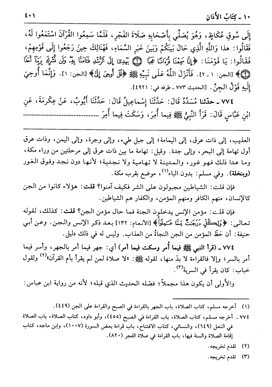774 - (قرأ النبي - صلى الله عليه وسلم - فيما أُمر وسكت فيما أمر) أي: جهر فيما أمر بالجهر، وأسر فيما أمر بالسر؛ وإلا فالقراءة لا بدّ منها، لقوله - صلى الله عليه وسلم -: "لا صلاة لمن لم يقرأ بأم القرآن" ولقول خباب: كان يقرأ في السرية.