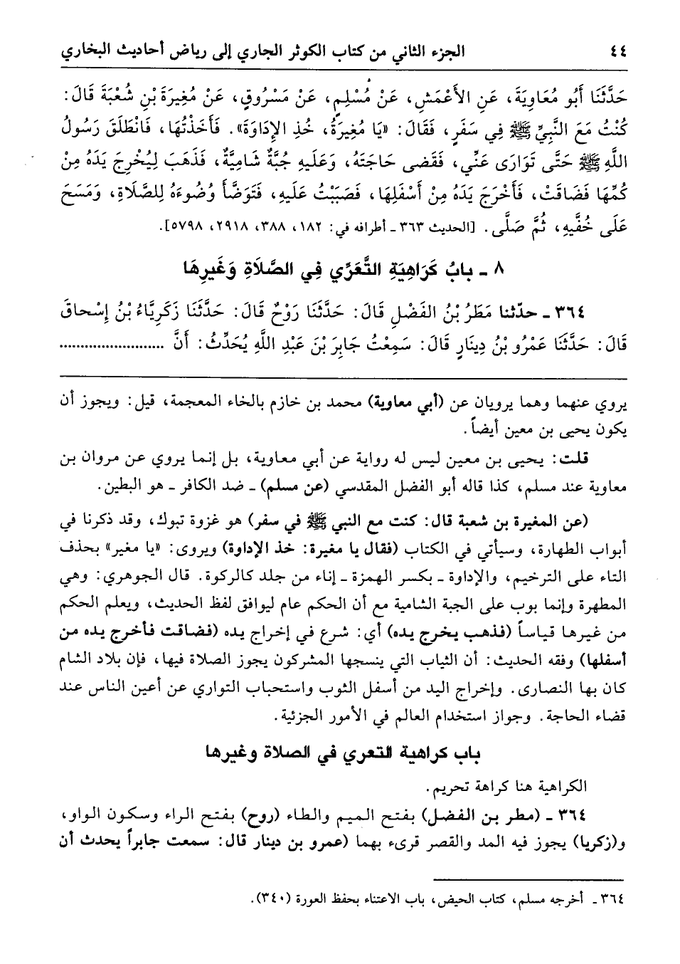 364 - (مطر بن الفضل) بفتح الميم والطاء (روح) بفتح الراء وسكون الواو، و (زكريا) يجوز فيه المد والقصر قرئ بهما (عمرو بن دينار قال: سمعت جابرًا يحدث أن