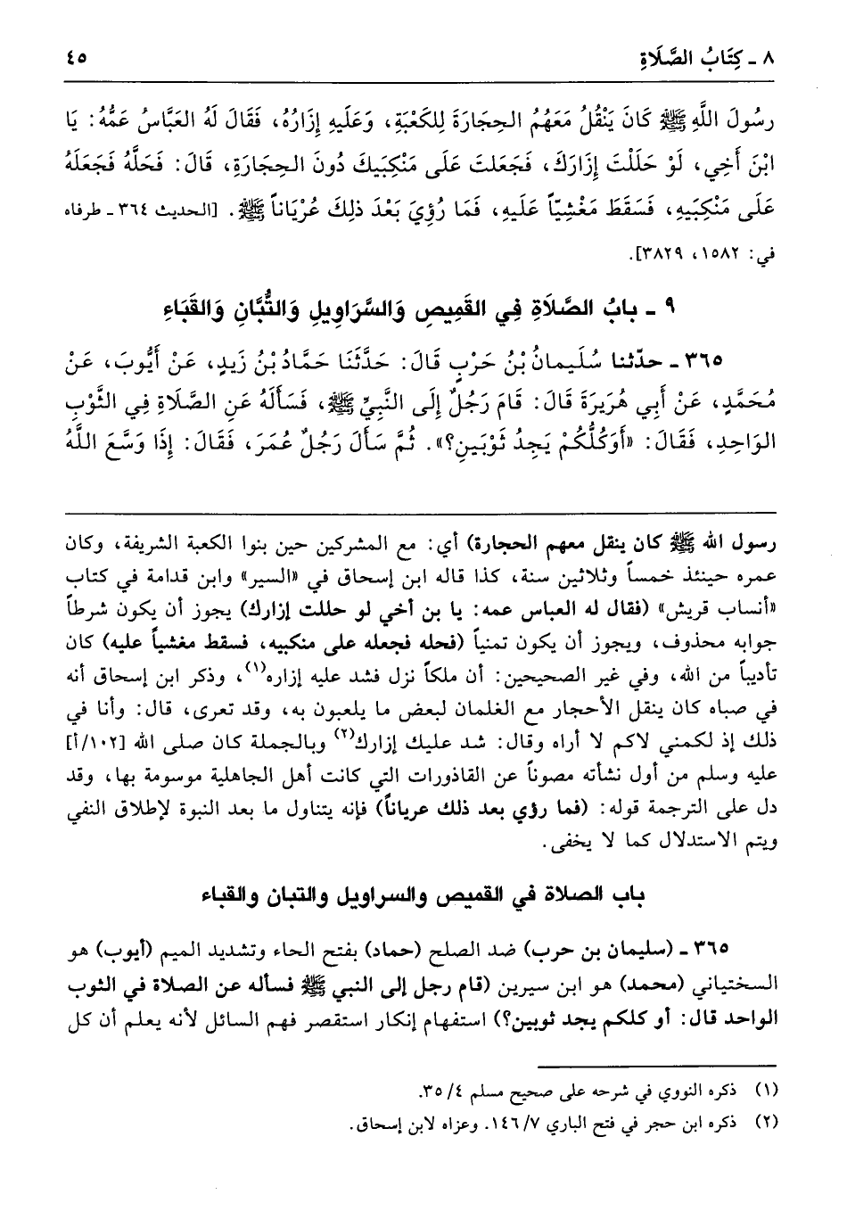 365 - (سليمان بن حرب) ضد الصلح (حماد) بفتح الحاء وتشديد الميم (أَيُّوب) هو السختياني (محمَّد) هو ابن سيرين (قام رجل إلى النَّبِيّ -صلى الله عليه وسلم- فسأله عن الصلاة في الثوب الواحد قال: أو كلكم يجد ثوبين؟) استفهام إنكار استقصر فهم السائل لأنه يعلم أن كل