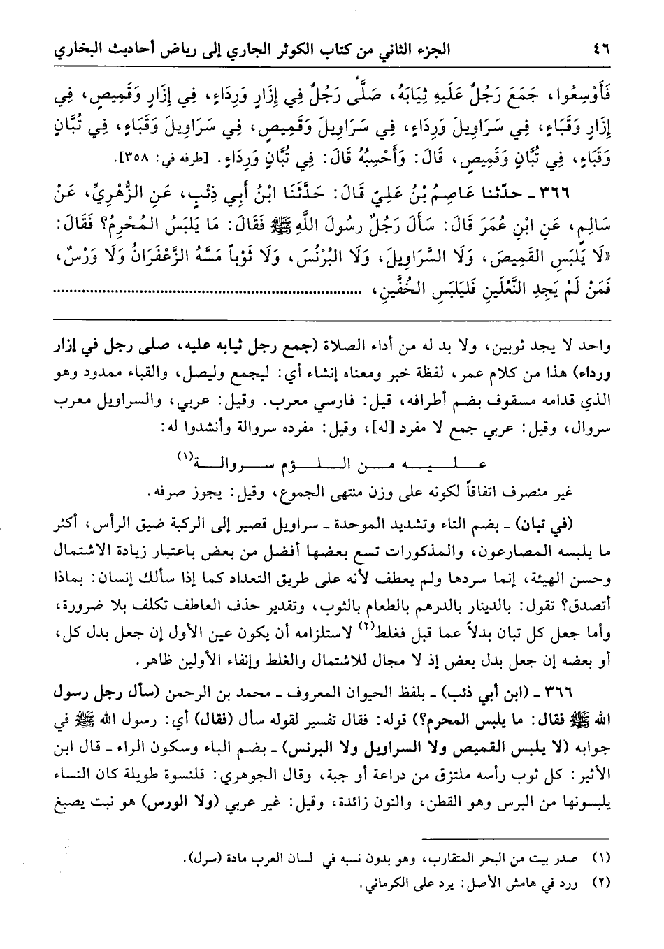 366 - (ابن أبي ذئب) -بلفظ الحيوان المعروف- محمَّد بن الرَّحْمَن (سأل رجل رسول الله - صلى الله عليه وسلم - فقال: ما يلبس المحرم؟) قوله: فقال تفسير لقوله سأل (فقال) أي: رسول الله - صلى الله عليه وسلم - في جوابه (لا يلبس القميص ولا السراويل ولا البرنس) -بضم الباء وسكون الراء- قال ابن الأثير: كل ثوب رأسه ملتزق من دراعة أو جبة، وقال الجوهري: قلنسوة طويلة كان النساء يلبسونها من البرس وهو القطن، والنون زائدة، وقيل: غير عربي (ولا الورس) هو نبت يصبغ