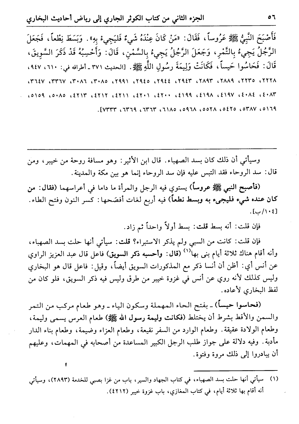 فَأَصْبَحَ النَّبِىُّ - صلى الله عليه وسلم - عَرُوسًا فَقَالَ «مَنْ كَانَ عِنْدَهُ شَىْءٌ فَلْيَجِئْ بِهِ». وَبَسَطَ نِطَعًا، فَجَعَلَ الرَّجُلُ يَجِئُ بِالتَّمْرِ، وَجَعَلَ الرَّجُلُ يَجِئُ بِالسَّمْنِ - قَالَ وَأَحْسِبُهُ قَدْ ذَكَرَ السَّوِيقَ - قَالَ فَحَاسُوا حَيْسًا، فَكَانَتْ وَلِيمَةَ رَسُولِ اللَّهِ - صلى الله عليه وسلم -. أطرافه 610، 947، 2228، 2235، 2889، 2893، 2943، 2944، 2945، 2991، 3085، 3086، 3367، 3647، 4083، 4084، 4197، 4198، 4199، 4200، 4201، 4211، 4212، 4213، 5085، 5159، 5169، 5387، 5425، 5528، 5968، 6185، 6363، 6369، 7333