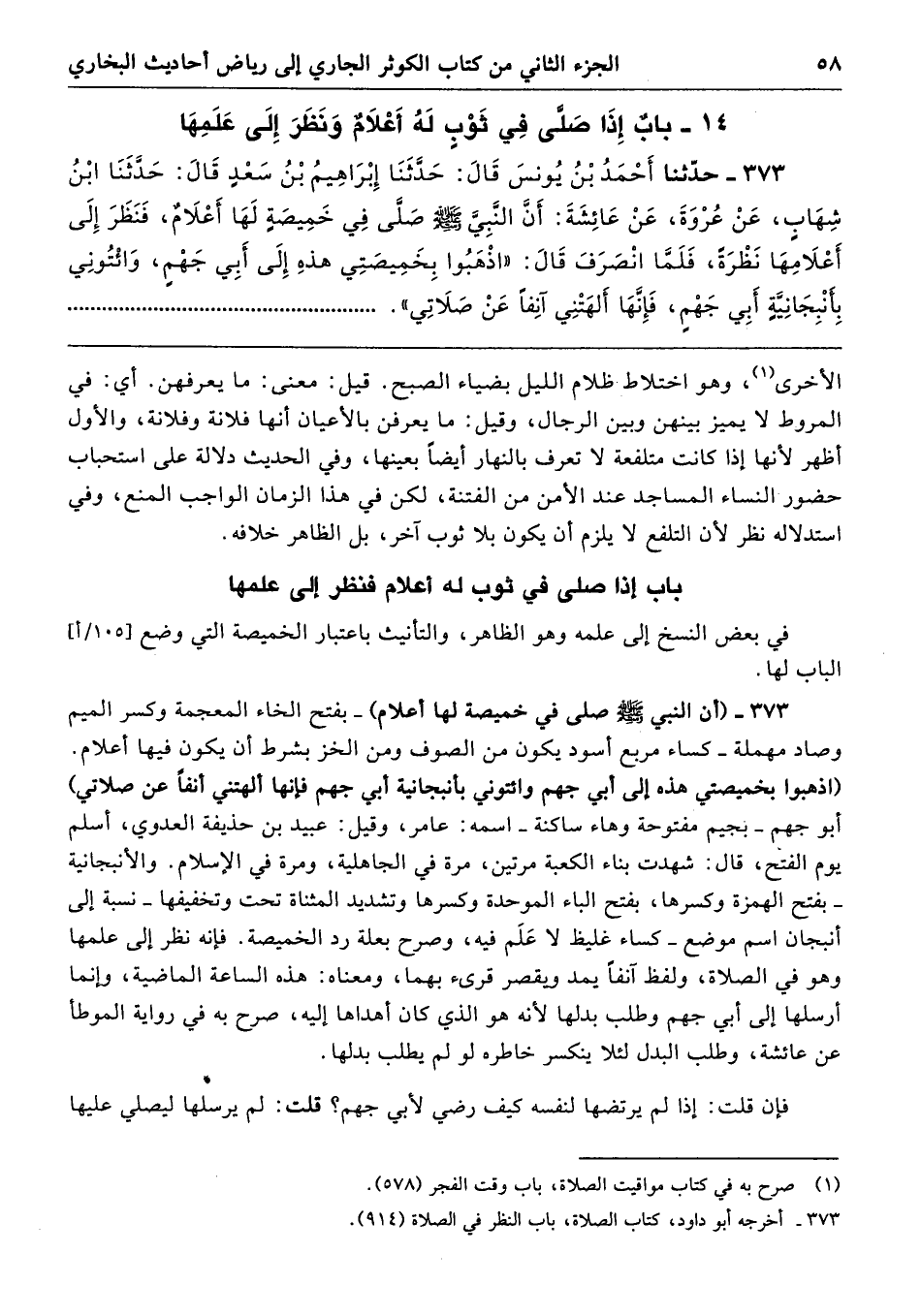 373 - (أن النَّبِيّ -صلى الله عليه وسلم- صلى في خميصة لها أعلام) -بفتح الخاء المعجمة وكسر الميم وصاد مهملة- كساء مربع أسود يكون من الصوف ومن الخز بشرط أن يكون فيها أعلام. (اذهبوا بخميصتي هذه إلى أبي جهم وائتوني بأنبجانية أبي جهم فإنَّها ألهتني أنفًا عن صلاتي) أبو جهم -بجيم مفتوحة وهاء ساكنة- اسمه: عامر، وقيل: عبيد بن حذيفة العدوي، أسلم يوم الفتح، قال: شهدت بناء الكعبة مرتين، مرة في الجاهلية، ومرة في الإِسلام. والأنبجانية -بفتح الهمزة وكسرها، بفتح الباء الموحدة وكسرها وتشديد المثناة تحت وتخفيفها- نسبة إلى أنبجان اسم موضع- كساء غليظ لا عَلَم فيه، وصرح بعلة رد الخميصة. فإنَّه نظر إلى علمها وهو في الصلاة، ولفظ آنفًا يمد ويقصر قرئ بهما، ومعناه: هذه الساعة الماضية، وإنما أرسلها إلى أبي جهم وطلب بدلها لأنه هو الذي كان أهداها إليه، صرح به في رواية الموطأ عن عائشة، وطلب البدل لئلا ينكسر خاطره لو لم يطلب بدلها.