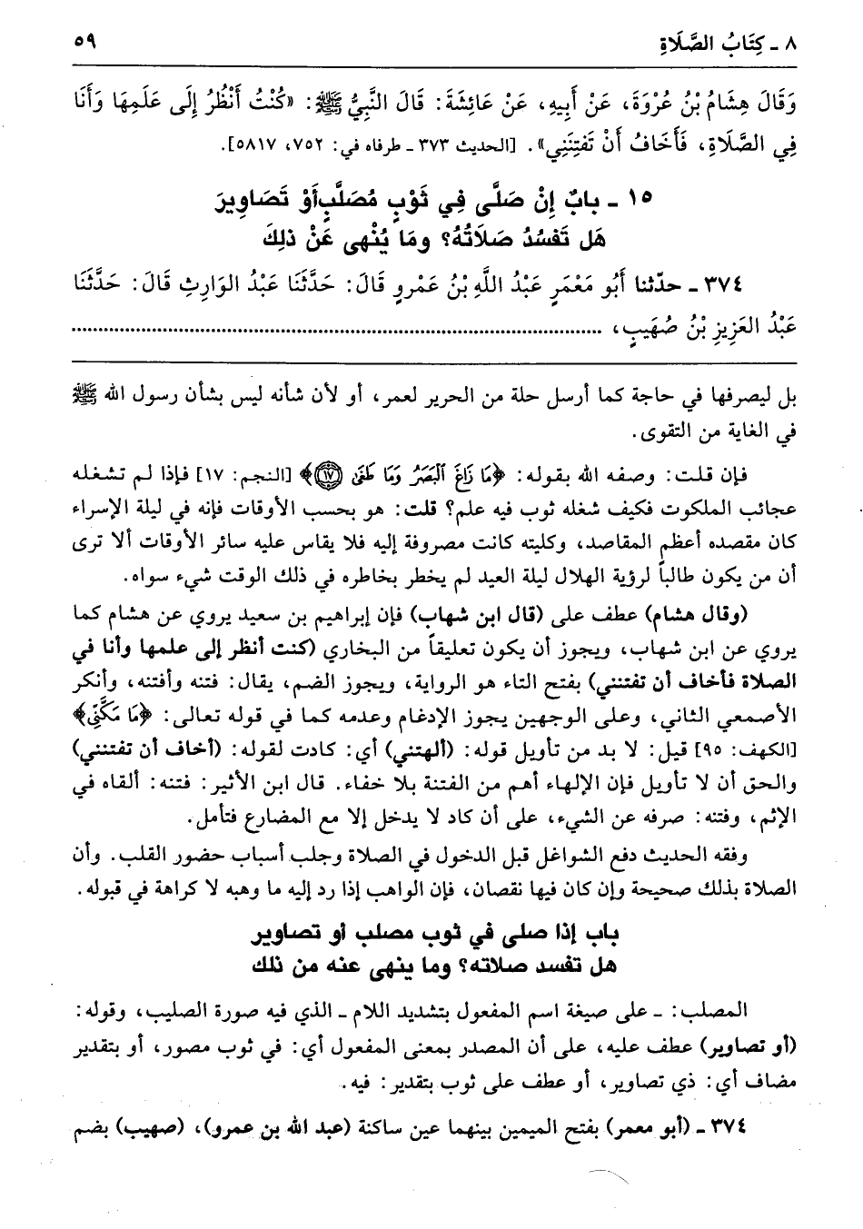 وَقَالَ هِشَامُ بْنُ عُرْوَةَ عَنْ أَبِيهِ عَنْ عَائِشَةَ قَالَ النَّبِىُّ - صلى الله عليه وسلم - «كُنْتُ أَنْظُرُ إِلَى عَلَمِهَا وَأَنَا فِي الصَّلاَةِ فَأَخَافُ أَنْ تَفْتِنَنِى». طرفاه 752، 5817