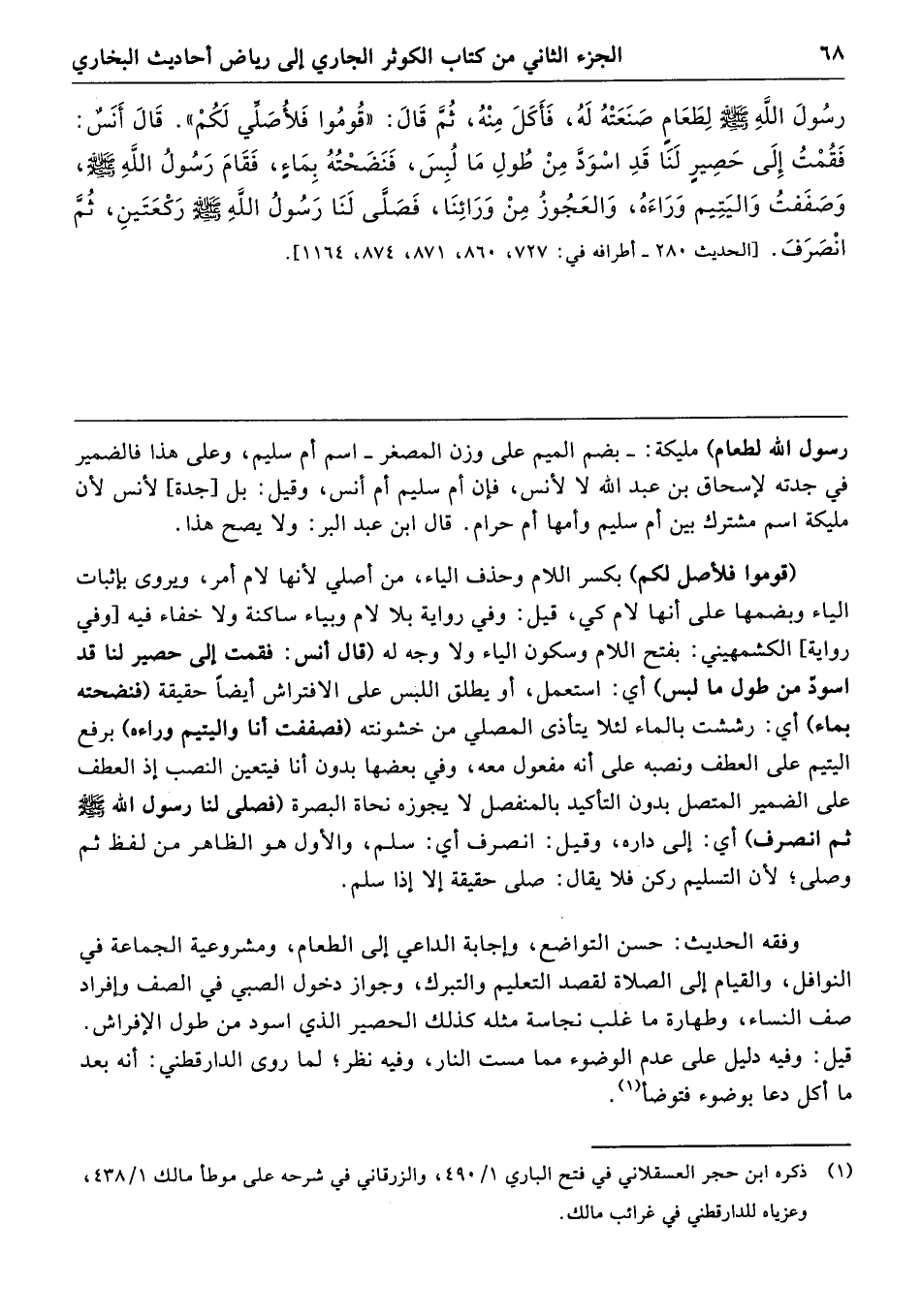 رَسُولَ اللَّهِ - صلى الله عليه وسلم - لِطَعَامٍ صَنَعَتْهُ لَهُ، فَأَكَلَ مِنْهُ ثُمَّ قَالَ «قُومُوا فَلأُصَلِّ لَكُمْ». قَالَ أَنَسٌ فَقُمْتُ إِلَى حَصِيرٍ لَنَا قَدِ اسْوَدَّ مِنْ طُولِ مَا لُبِسَ، فَنَضَحْتُهُ بِمَاءٍ، فَقَامَ رَسُولُ اللَّهِ - صلى الله عليه وسلم - وَصَفَفْتُ وَالْيَتِيمَ وَرَاءَهُ، وَالْعَجُوزُ مِنْ وَرَائِنَا، فَصَلَّى لَنَا رَسُولُ اللَّهِ - صلى الله عليه وسلم - رَكْعَتَيْنِ ثُمَّ انْصَرَفَ. أطرافه 727، 860، 871، 874، 1164