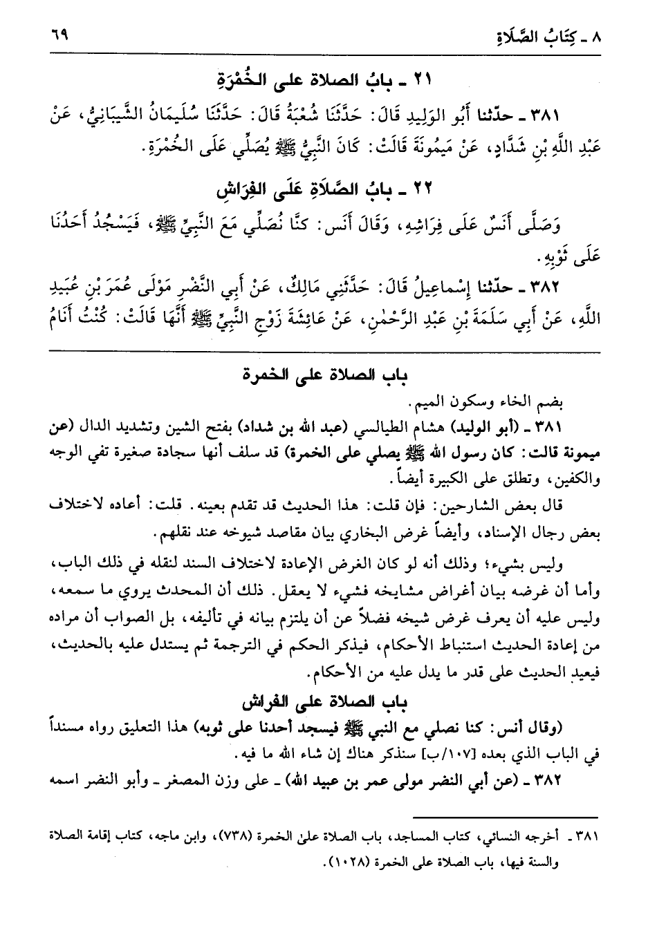 381 - (أبو الوليد) هشام الطيالسي (عبد الله بن شداد) بفتح الشين وتشديد الدال (عن ميمونة قالت: كان رسول الله - صلى الله عليه وسلم - يصلي على الخمرة) قد سلف أنها سجادة صغيرة تفي الوجه والكفين، وتطلق على الكبيرة أيضًا.