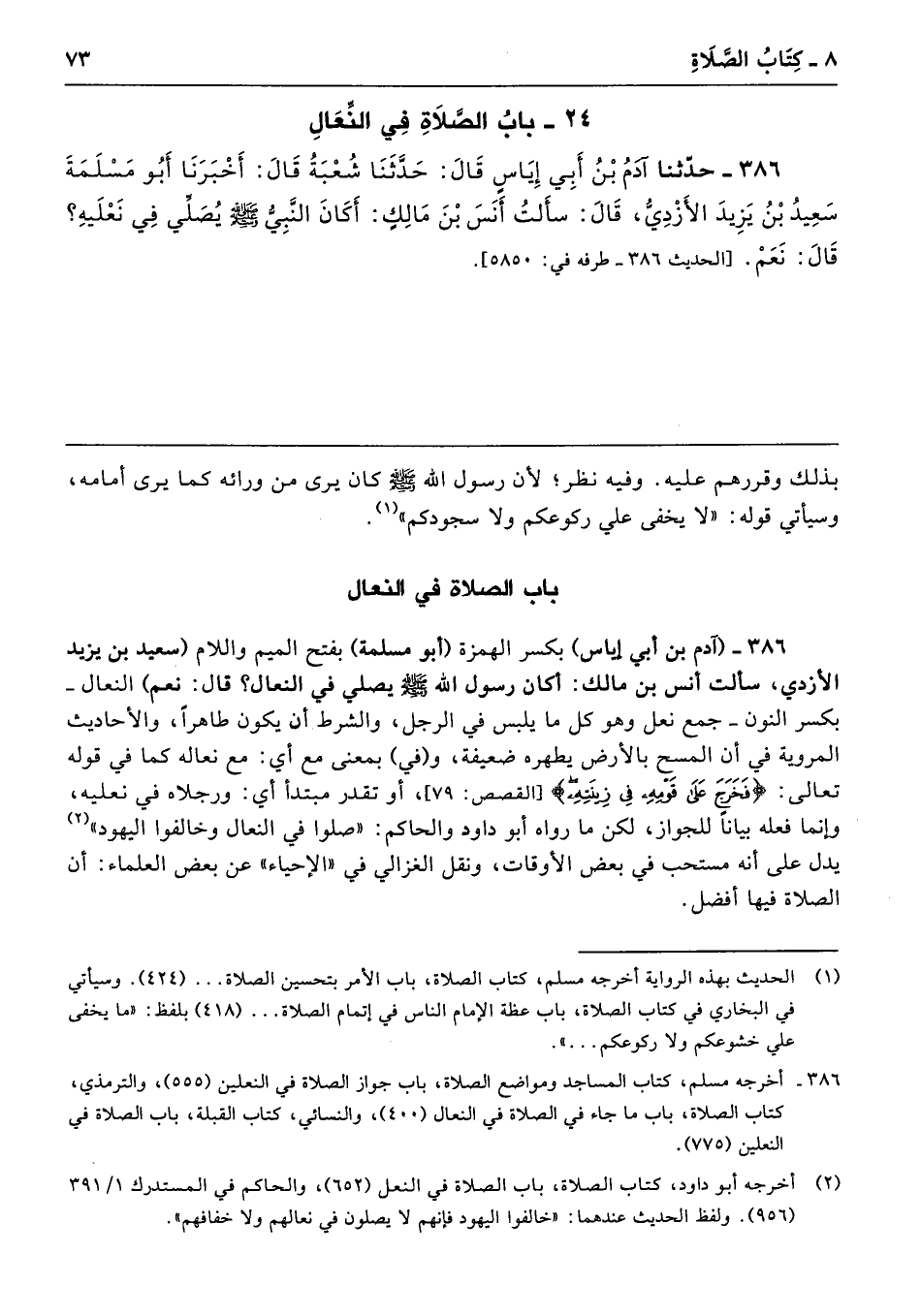 386 - حَدَّثَنَا آدَمُ بْنُ أَبِى إِيَاسٍ قَالَ حَدَّثَنَا شُعْبَةُ قَالَ أَخْبَرَنَا أَبُو مَسْلَمَةَ سَعِيدُ بْنُ يَزِيدَ الأَزْدِىُّ قَالَ سَأَلْتُ أَنَسَ بْنَ مَالِكٍ أَكَانَ النَّبِىُّ - صلى الله عليه وسلم - يُصَلِّى فِي نَعْلَيْهِ قَالَ نَعَمْ. طرفه 5850