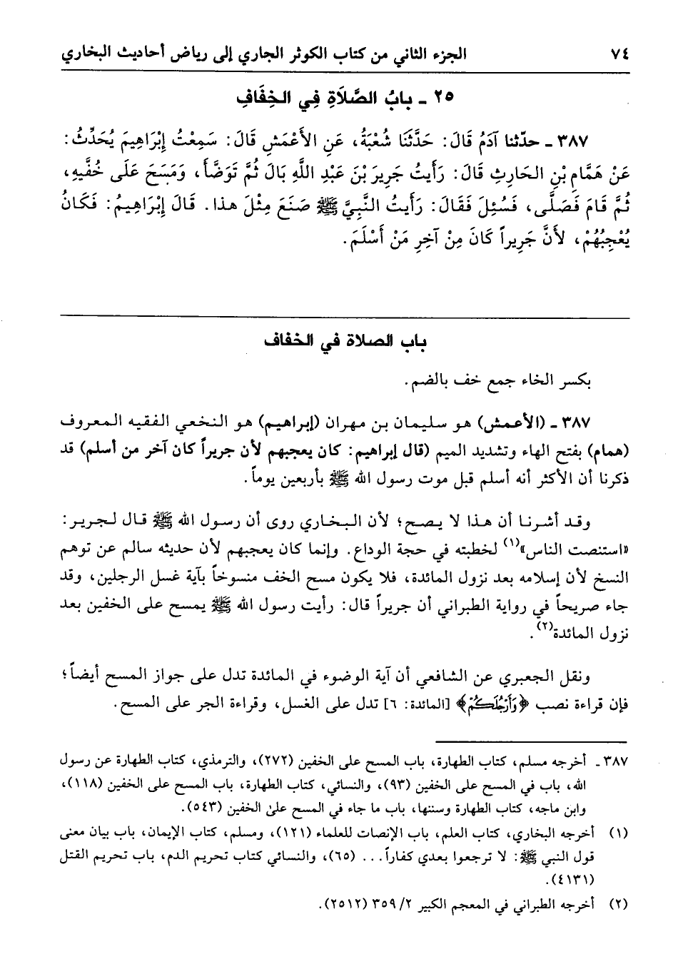 387 - حَدَّثَنَا آدَمُ قَالَ حَدَّثَنَا شُعْبَةُ عَنِ الأَعْمَشِ قَالَ سَمِعْتُ إِبْرَاهِيمَ يُحَدِّثُ عَنْ هَمَّامِ بْنِ الْحَارِثِ قَالَ رَأَيْتُ جَرِيرَ بْنَ عَبْدِ اللَّهِ بَالَ ثُمَّ تَوَضَّأَ، وَمَسَحَ عَلَى خُفَّيْهِ، ثُمَّ قَامَ فَصَلَّى، فَسُئِلَ فَقَالَ رَأَيْتُ النَّبِىَّ - صلى الله عليه وسلم - صَنَعَ مِثْلَ هَذَا. قَالَ إِبْرَاهِيمُ فَكَانَ يُعْجِبُهُمْ، لأَنَّ جَرِيرًا كَانَ مِنْ آخِرِ مَنْ أَسْلَمَ.