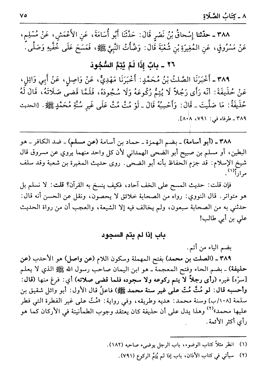 389 - أَخْبَرَنَا الصَّلْتُ بْنُ مُحَمَّدٍ أَخْبَرَنَا مَهْدِىٌّ عَنْ وَاصِلٍ عَنْ أَبِى وَائِلٍ عَنْ حُذَيْفَةَ رَأَى رَجُلاً لاَ يُتِمُّ رُكُوعَهُ وَلاَ سُجُودَهُ، فَلَمَّا قَضَى صَلاَتَهُ قَالَ لَهُ حُذَيْفَةُ مَا صَلَّيْتَ - قَالَ وَأَحْسِبُهُ قَالَ - لَوْ مُتَّ مُتَّ عَلَى غَيْرِ سُنَّةِ مُحَمَّدٍ - صلى الله عليه وسلم -. طرفاه 791، 808