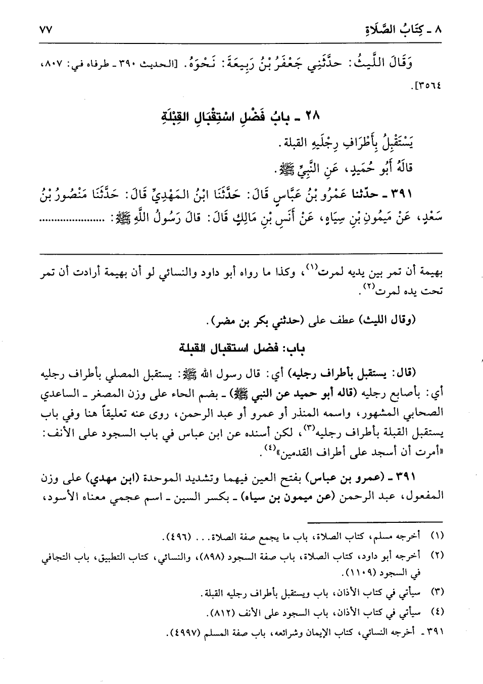 28 - باب فَضْلِ اسْتِقْبَالِ الْقِبْلَةِ يَسْتَقْبِلُ بِأَطْرَافِ رِجْلَيْهِ. قَالَ أَبُو حُمَيْدٍ عَنِ النَّبِيِّ - صلى الله عليه وسلم -.