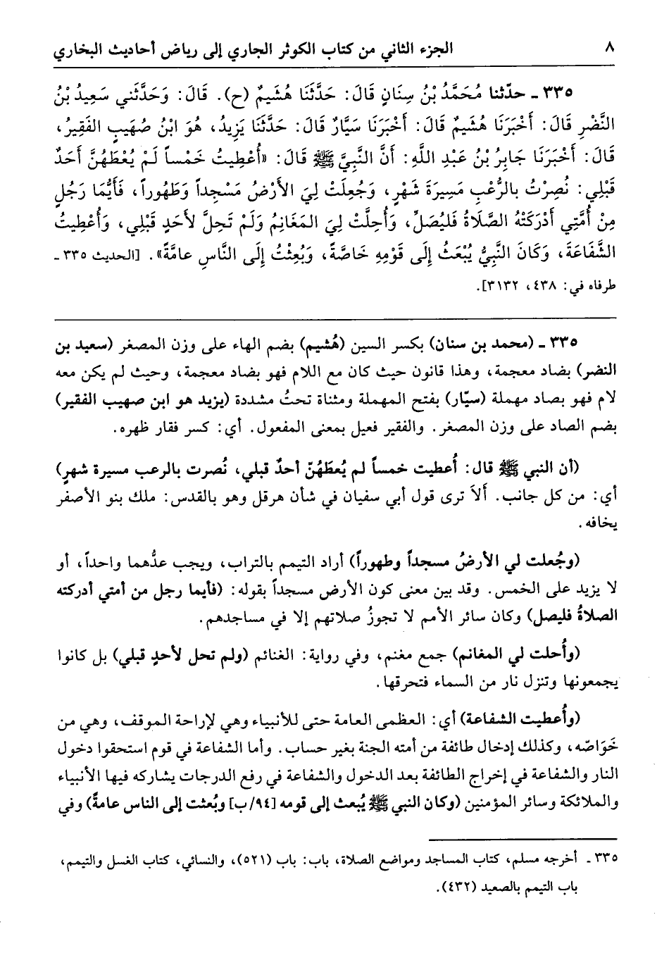 335 - حَدَّثَنَا مُحَمَّدُ بْنُ سِنَانٍ قَالَ حَدَّثَنَا هُشَيْمٌ ح قَالَ وَحَدَّثَنِى سَعِيدُ بْنُ النَّضْرِ قَالَ أَخْبَرَنَا هُشَيْمٌ قَالَ أَخْبَرَنَا سَيَّارٌ قَالَ حَدَّثَنَا يَزِيدُ - هُوَ ابْنُ صُهَيْبٍ الْفَقِيرُ - قَالَ أَخْبَرَنَا جَابِرُ بْنُ عَبْدِ اللَّهِ أَنَّ النَّبِىَّ - صلى الله عليه وسلم - قَالَ «أُعْطِيتُ خَمْسًا لَمْ يُعْطَهُنَّ أَحَدٌ قَبْلِى نُصِرْتُ بِالرُّعْبِ مَسِيرَةَ شَهْرٍ، وَجُعِلَتْ لِىَ الأَرْضُ مَسْجِدًا وَطَهُورًا، فَأَيُّمَا رَجُلٍ مِنْ أُمَّتِى أَدْرَكَتْهُ الصَّلاَةُ فَلْيُصَلِّ، وَأُحِلَّتْ لِىَ الْمَغَانِمُ وَلَمْ تَحِلَّ لأَحَدٍ قَبْلِى، وَأُعْطِيتُ الشَّفَاعَةَ، وَكَانَ النَّبِىُّ يُبْعَثُ إِلَى قَوْمِهِ خَاصَّةً، وَبُعِثْتُ إِلَى النَّاسِ عَامَّةً». طرفاه 438، 3122