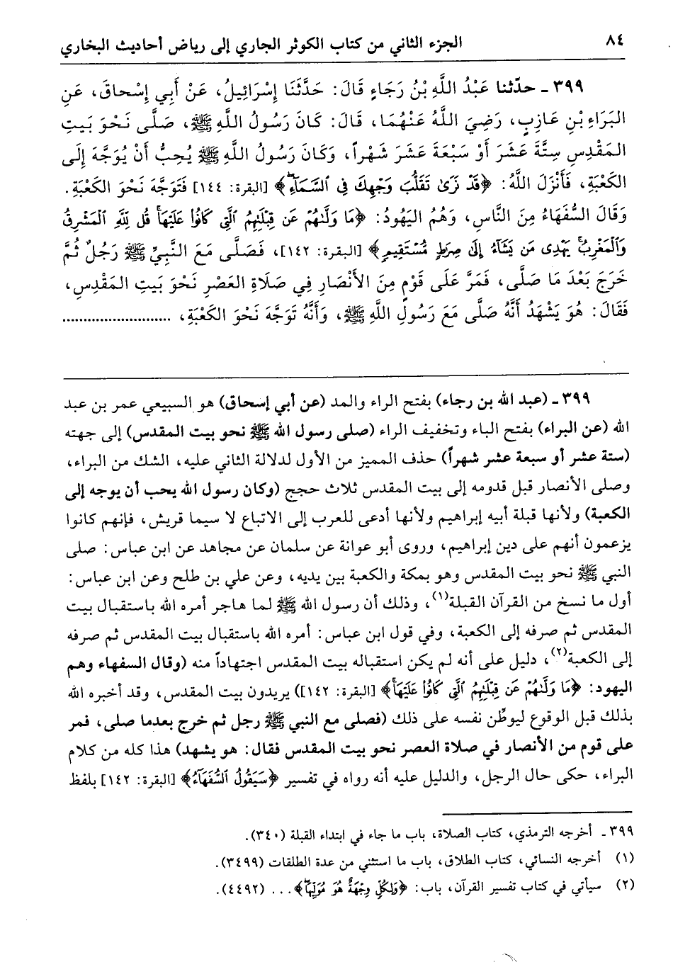 399 - (عبد الله بن رجاء) بفتح الراء والمد (عن أبي إسحاق) هو السبيعي عمر بن عبد الله (عن البراء) بفتح الباء وتخفيف الراء (صلى رسول الله - صلى الله عليه وسلم - نحو بيت المقدس) إلى جهته (ستة عشر أو سبعة عشر شهرًا) حذف المميز من الأول لدلالة الثاني عليه، الشك من البراء، وصلى الأنصار قبل قدومه إلى بيت المقدس ثلاث حجج (وكان رسول الله يحب أن يوجه إلى الكعبة) ولأنها قبلة أبيه إبراهيم ولأنها أدعى للعرب إلى الاتباع لا سيما قريش، فإنهم كانوا يزعمون أنهم على دين إبراهيم، وروى أبو عوانة عن سلمان عن مجاهد عن ابن عباس: صلى النبي - صلى الله عليه وسلم - نحو بيت المقدس وهو بمكة والكعبة بين يديه، وعن علي بن طلح وعن ابن عباس: أول ما نسخ من القرآن القبلة، وذلك أن رسول الله - صلى الله عليه وسلم - لما هاجر أمره الله باستقبال بيت المقدس ثم صرفه إلى الكعبة، وفي قول ابن عباس: أمره الله باستقبال بيت المقدس ثم صرفه إلى الكعبة، دليل على أنه لم يكن استقباله بيت المقدس اجتهادًا منه (وقال السفهاء وهم اليهود: {مَا وَلَّاهُمْ عَنْ قِبْلَتِهِمُ الَّتِي كَانُوا عَلَيْهَا} [البقرة: 142]) يريدون بيت المقدس، وقد أخبره الله بذلك قبل الوقوع ليوطِّن نفسه على ذلك (فصلى مع النبي - صلى الله عليه وسلم - رجل ثم خرج بعدما صلى، فمر على قوم من الأنصار في صلاة العصر نحو بيت المقدس فقال: هو يشهد) هذا كله من كلام البراء، حكى حال الرجل، والدليل عليه أنه رواه في تفسير {سَيَقُولُ السُّفَهَاءُ} [البقرة: 142] بلفظ