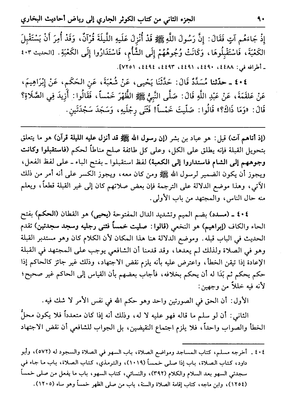 404 - (مسدد) بضم الميم وتشديد الدال المفتوحة (يحيى) هو القطان (الحكم) بفتح الحاء والكاف (إبراهيم) هو النخعي (قالوا: صليت خمسًا فثنى رجليه وسجد سجدتين) تقدم الحديث في الباب قبله. وموضع الدلالة هنا هذا المكان لأن الكلام كان وهو مستدبر القبلة وهو في الصلاة ولذلك لم يعدها، وقد قدمنا أن الشافعي يوجب على المجتهد في القبلة الإعادة إذا تيقن الخطأ، واعترض عليه بأنه يلزم نقض الاجتهاد، وذلك غير جائز كالحاكم إذا حكم يحكم ثم بَدَا له أن يحكم بخلافه، فأجاب بعضهم بأن القياس إلى الحاكم غير صحيح؛ لأنه فيه خللًا من وجهين:
