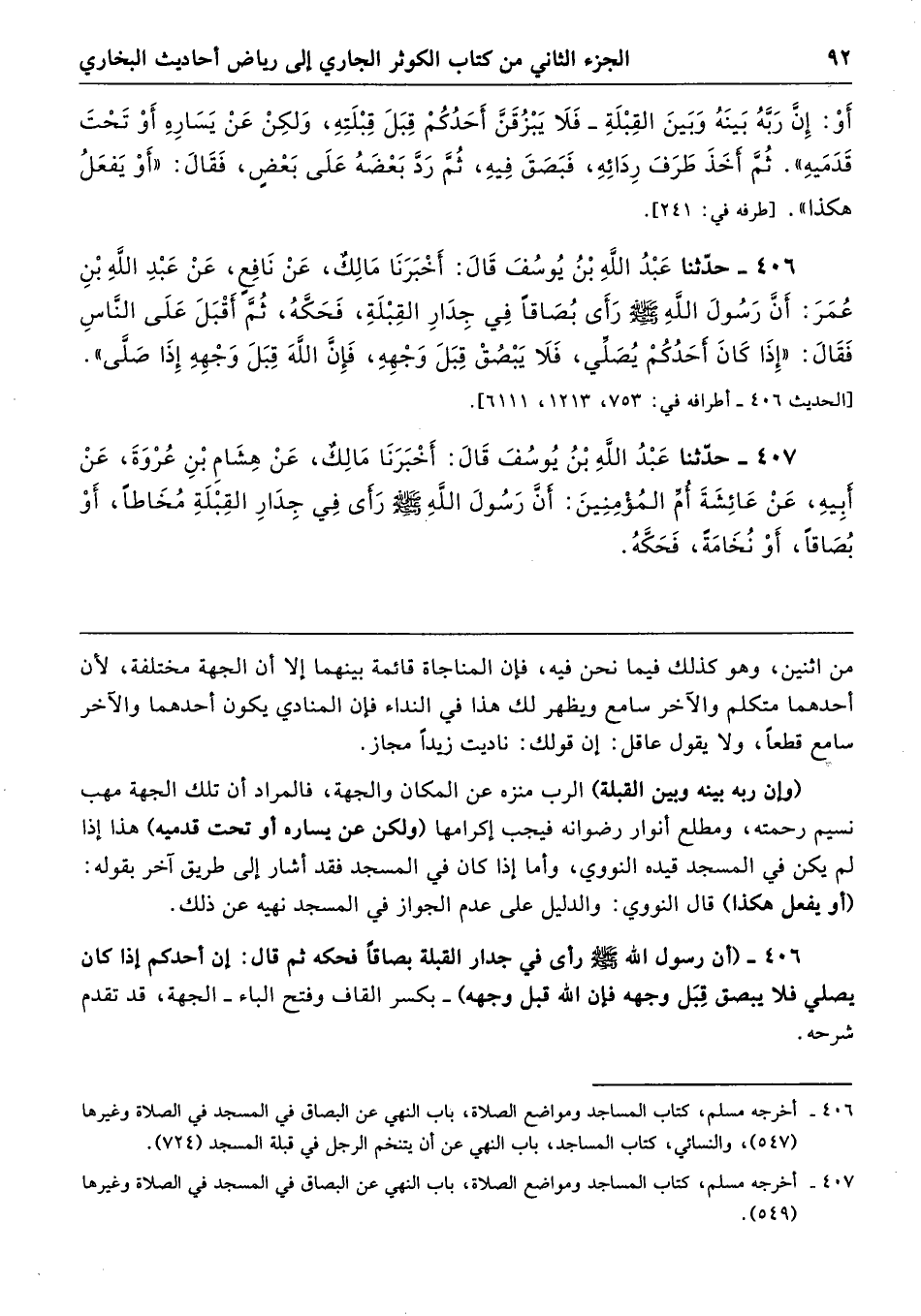 406 - (أن رسول الله - صلى الله عليه وسلم - رأى في جدار القبلة بصاقًا فحكه ثم قال: إن أحدكم إذا كان يصلي فلا يبصق قِبَل وجهه فإن الله قبل وجهه) -بكسر القاف وفتح الباء- الجهة، قد تقدم شرحه.