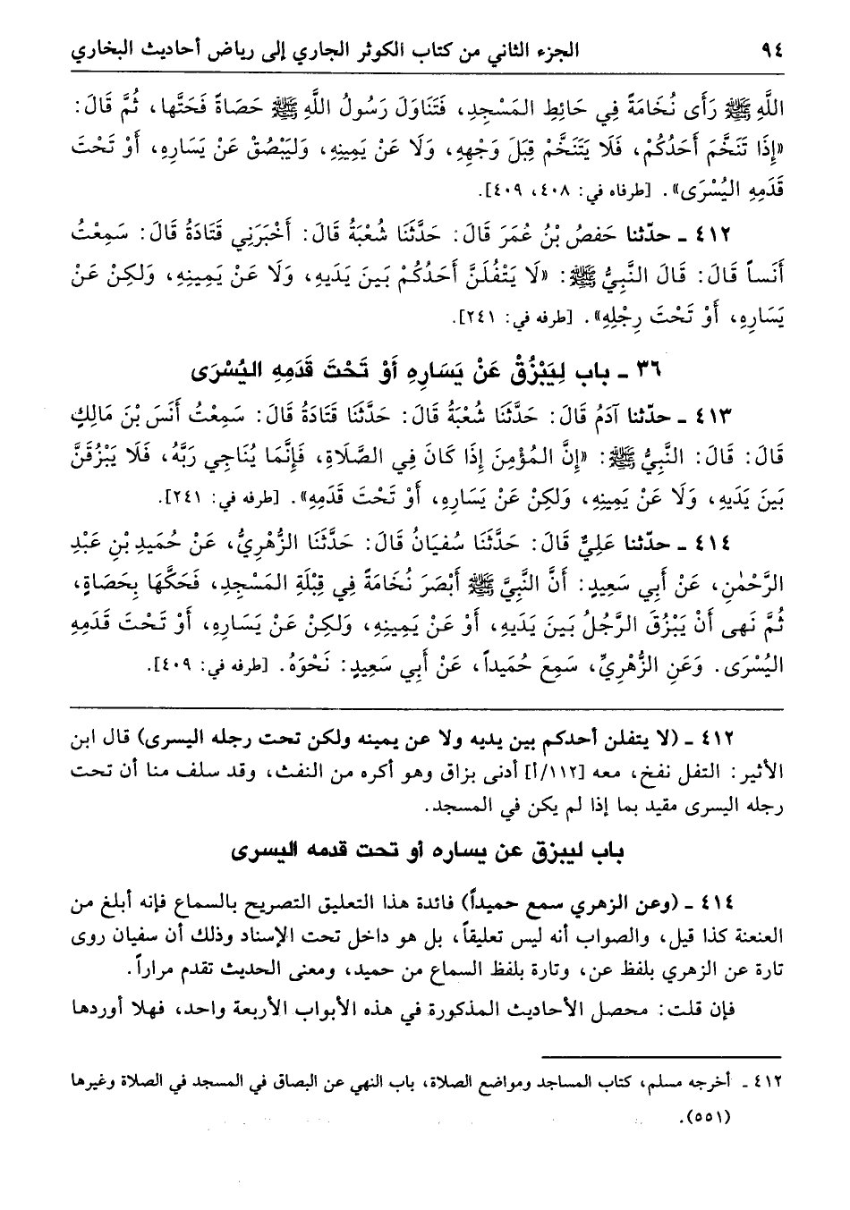 414 - حَدَّثَنَا عَلِىٌّ قَالَ حَدَّثَنَا سُفْيَانُ حَدَّثَنَا الزُّهْرِىُّ عَنْ حُمَيْدِ بْنِ عَبْدِ الرَّحْمَنِ عَنْ أَبِى سَعِيدٍ. أَنَّ النَّبِىَّ - صلى الله عليه وسلم - أَبْصَرَ نُخَامَةً فِي قِبْلَةِ الْمَسْجِدِ فَحَكَّهَا بِحَصَاةٍ، ثُمَّ نَهَى أَنْ يَبْزُقَ الرَّجُلُ بَيْنَ يَدَيْهِ أَوْ عَنْ يَمِينِهِ، وَلَكِنْ عَنْ يَسَارِهِ أَوْ تَحْتَ قَدَمِهِ الْيُسْرَى. وَعَنِ الزُّهْرِىِّ سَمِعَ حُمَيْدًا عَنْ أَبِى سَعِيدٍ نَحْوَهُ. طرفه 409