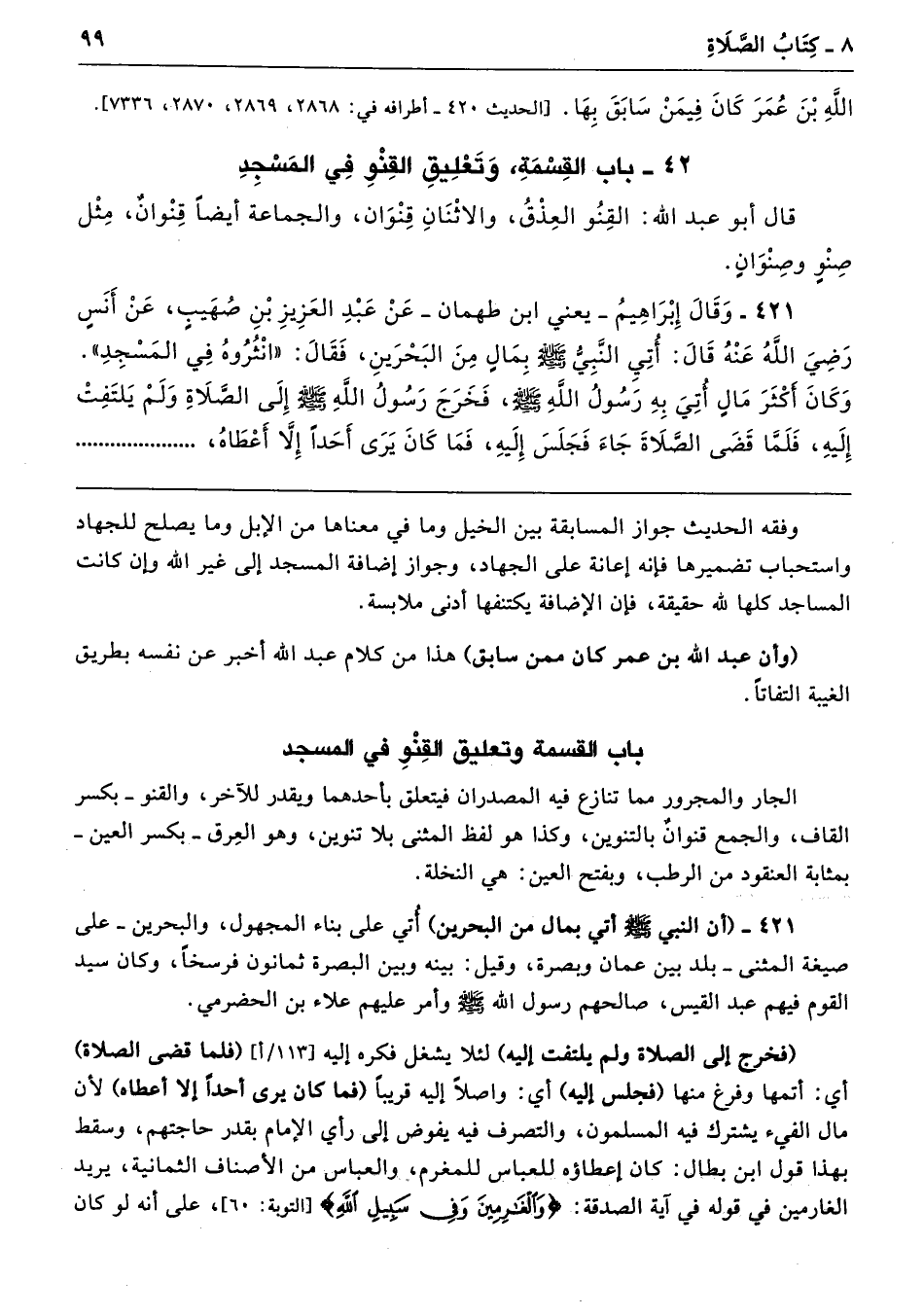 421 - (أن النبي - صلى الله عليه وسلم - أتي بمال من البحرين) أُتي على بناء المجهول، والبحرين -على صيغة المثنى- بلد بين عمان وبصرة، وقيل: بينه وبين البصرة ثمانون فرسخًا، وكان سيد القوم فيهم عبد القيس، صالحهم رسول الله - صلى الله عليه وسلم - وأمر عليهم علاء بن الحضرمي.