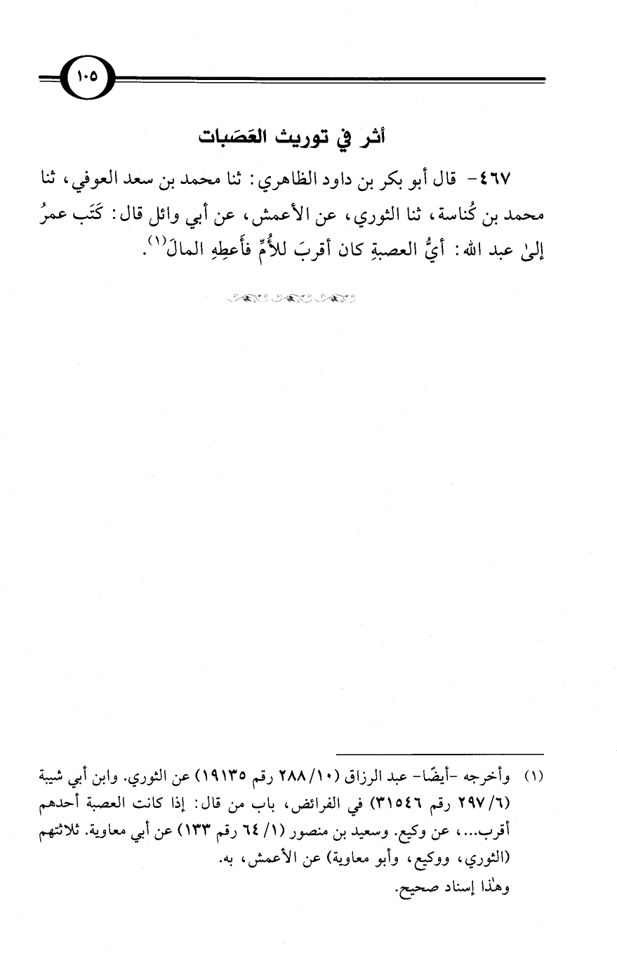 (467) قال أبو بكر بن داود الظاهري: ثنا محمد بن سعد العوفي، ثنا محمد بن كُناسة، ثنا الثوري، عن الأعمش، عن أبي وائل قال: كَتَب عمرُ إلى عبد الله: أيُّ العصبةِ كان أقربَ للأُمِّ فأَعطِهِ المالَ (¬1).