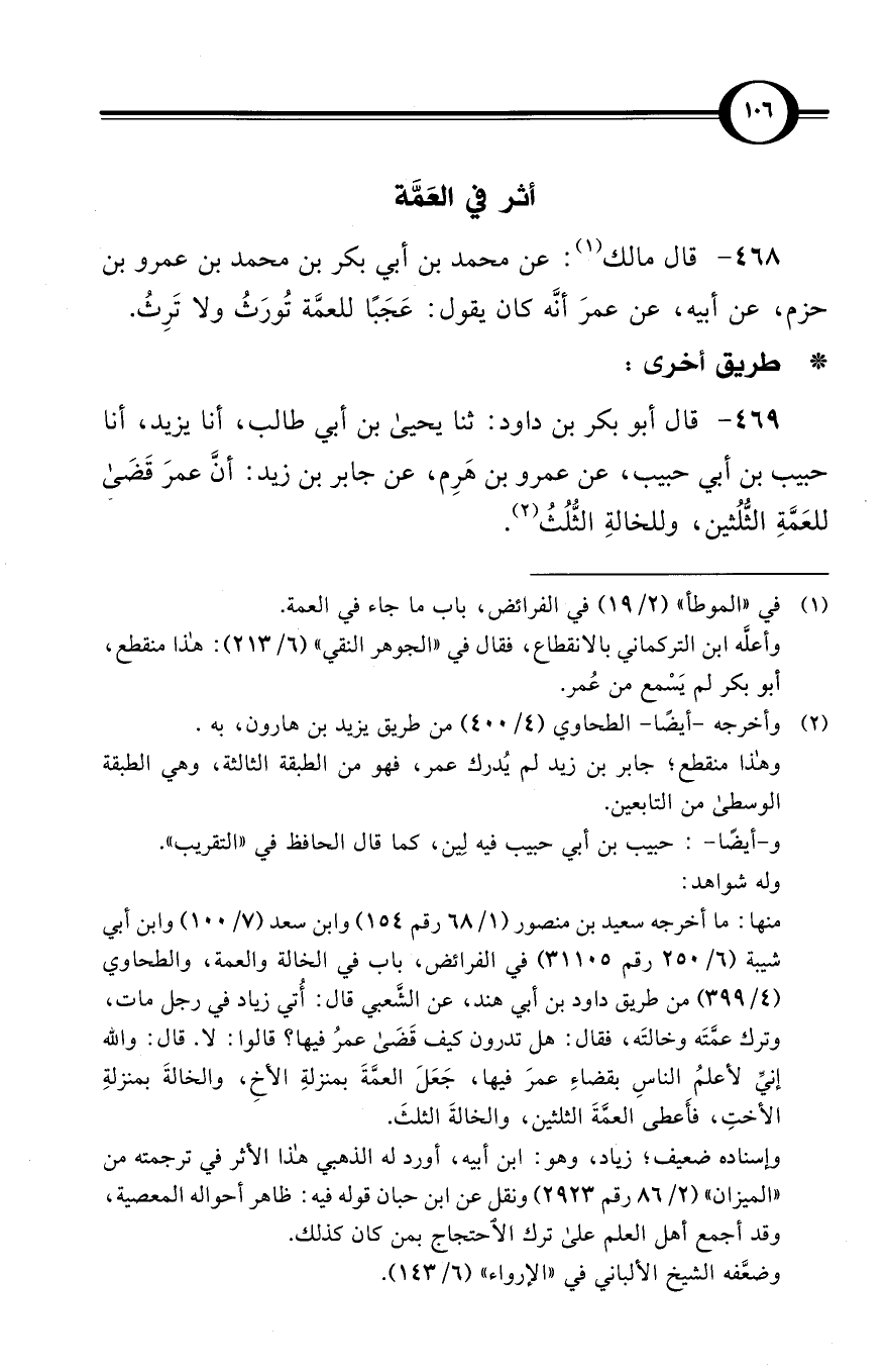 (469) قال أبو بكر بن داود: ثنا يحيى بن أبي طالب، أنا يزيد، أنا حبيب بن أبي حبيب، عن عمرو بن هَرِم، عن جابر بن زيد: أنَّ عمرَ قَضَى للعَمَّةِ الثُّلُثين، وللخالةِ الثُّلُثُ (¬2).