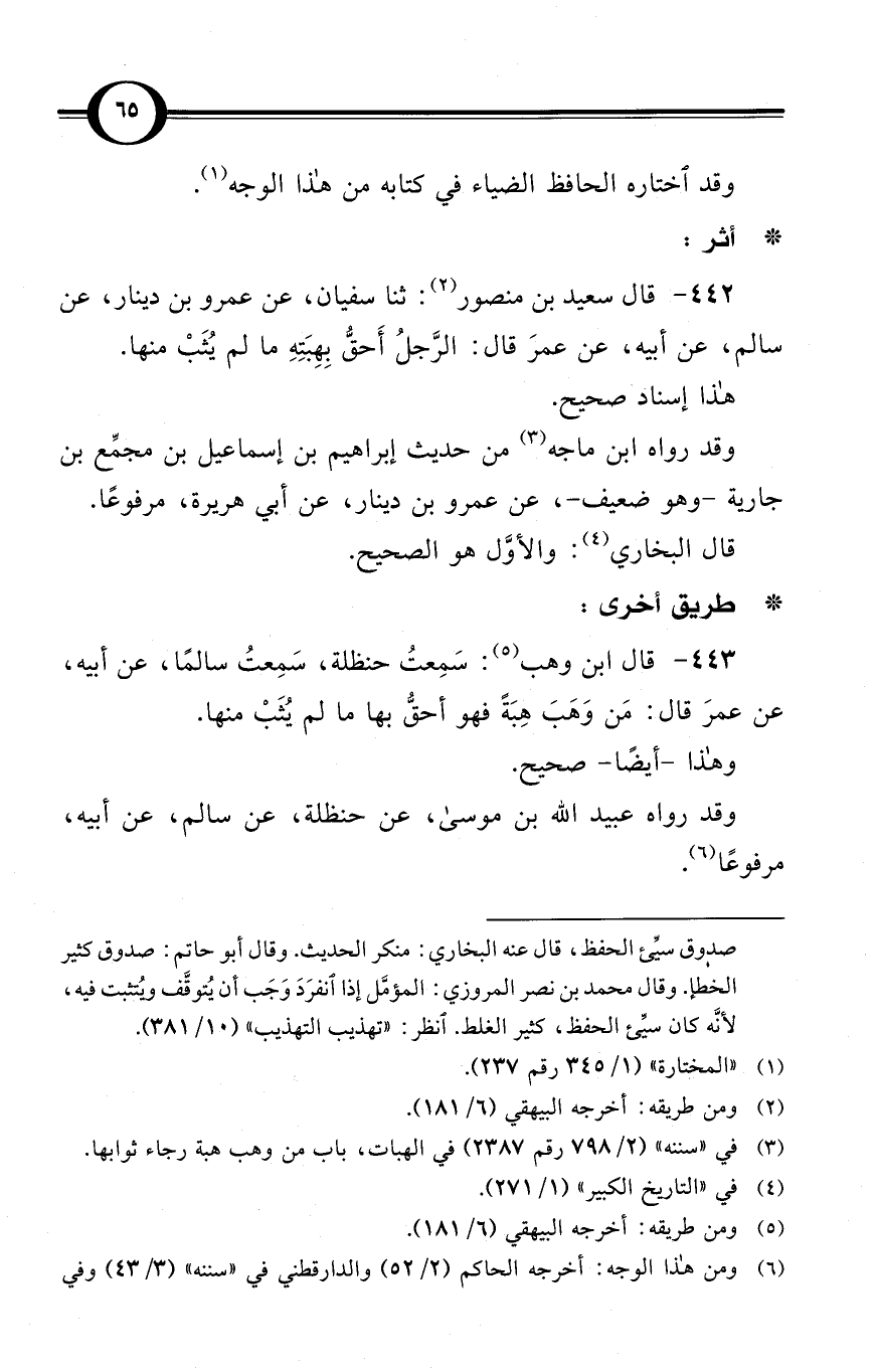 (443) قال ابن وهب (¬5): سَمِعتُ حنظلة، سَمِعتُ سالمًا، عن أبيه، عن عمرَ قال: مَن وَهَبَ هِبَةً فهو أحقُّ بها ما لم يُثَبْ منها.