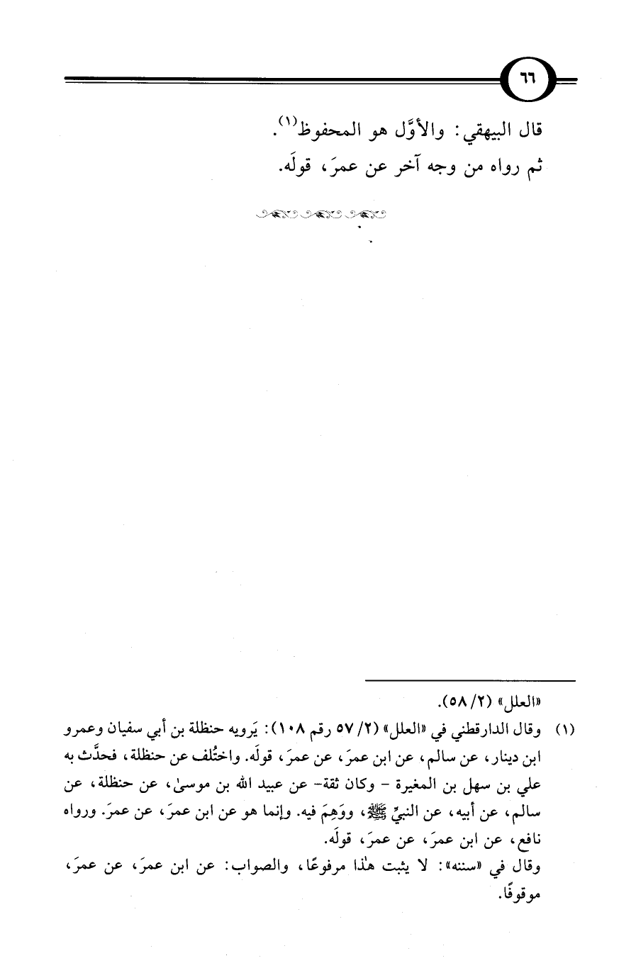 (¬1) وقال الدارقطني في «العلل» (2/ 57 رقم 108): يَرويه حنظلة بن أبي سفيان وعمرو بن دينار، عن سالم، عن ابن عمرَ، عن عمرَ، قولَه. واختُلف عن حنظلة، فحدَّث به علي بن سهل بن المغيرة -وكان ثقة- عن عبيد الله بن موسى، عن حنظلة، عن سالم، عن أبيه، عن النبيِّ صلى الله عليه وسلم، ووَهِمَ فيه. وإنما هو عن ابن عمرَ، عن عمرَ. ورواه نافع، عن ابن عمرَ، عن عمرَ، قولَه.