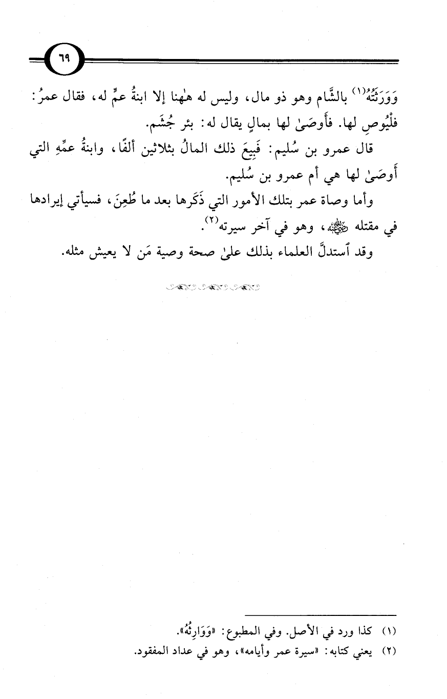 وَوَرَثَتُهُ (¬1) بالشَّام وهو ذو مال، وليس له ههنا إلا ابنةُ عمٍّ له، فقال عمرُ: فلْيُوصِ لها. فأَوصَى لها بمالٍ يقال له: بئر جُشَم.