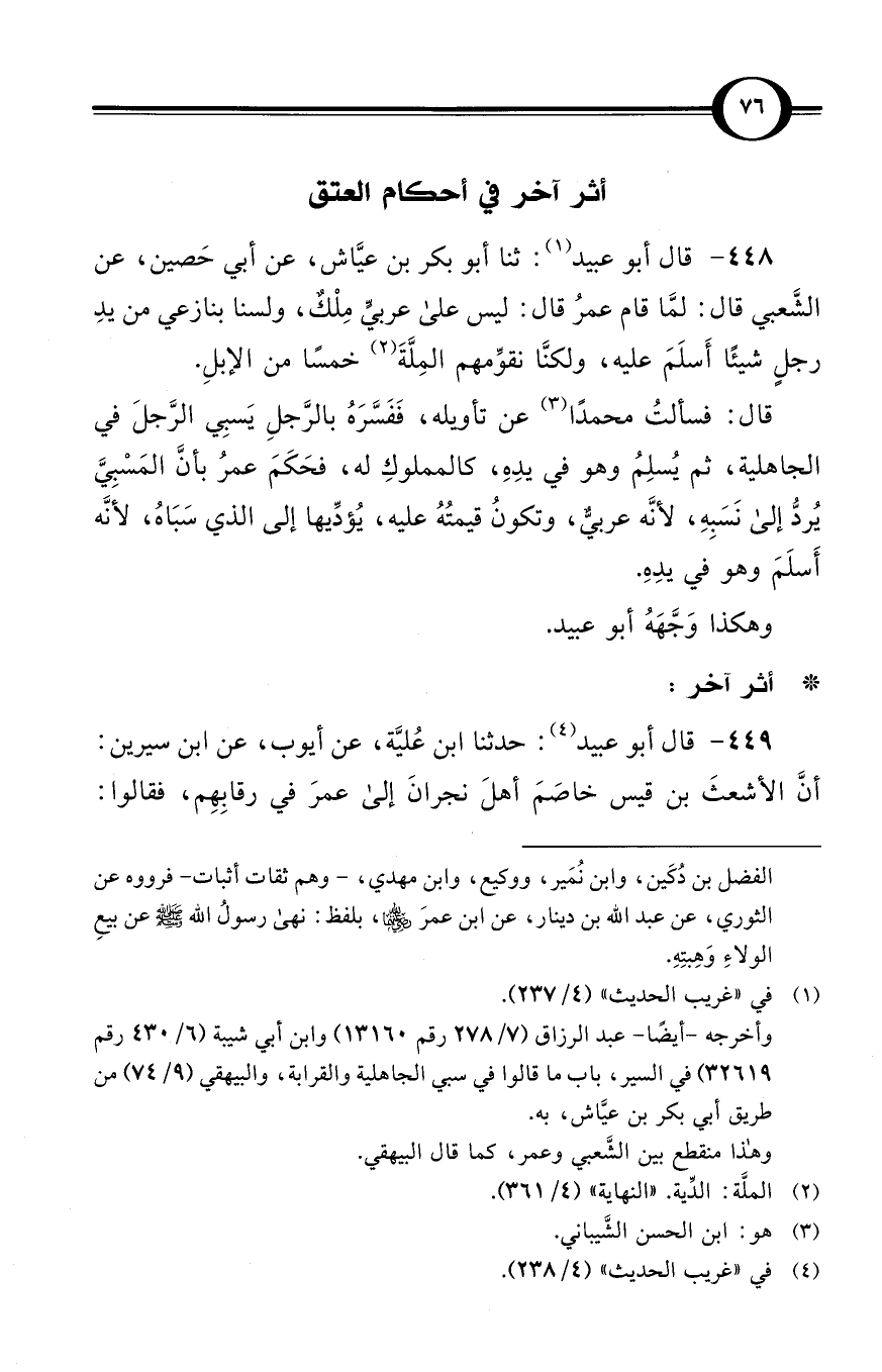 (448) قال أبو عبيد (¬1): ثنا أبو بكر بن عيَّاش، عن أبي حَصين، عن الشَّعبي قال: لمَّا قام عمرُ قال: ليس على عربيٍّ مِلْكٌ، ولسنا بنازعي من يدِ رجلٍ شيئًا أَسلَمَ عليه، ولكنَّا نقوِّمهم المِلَّةَ (¬2) خمسًا من الإبلِ.