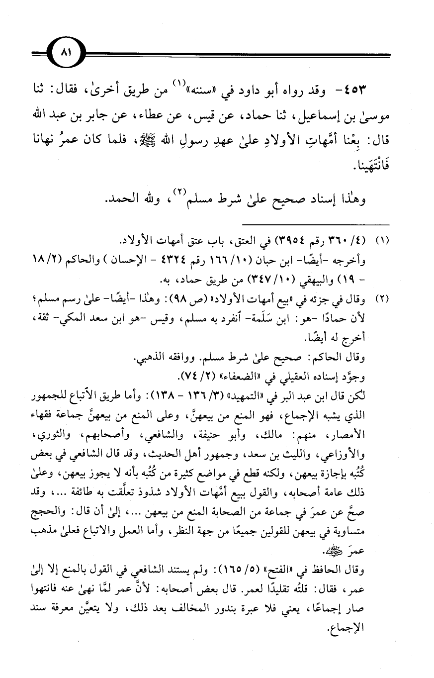(453) وقد رواه أبو داود في «سننه» (¬1) من طريق أخرى، فقال: ثنا موسى بن إسماعيل، ثنا حماد، عن قيس، عن عطاء، عن جابر بن عبد الله قال: بِعْنا أمَّهاتِ الأولادِ على عهدِ رسولِ الله صلى الله عليه وسلم، فلما كان عمرُ نهانا فَانْتَهَينا.