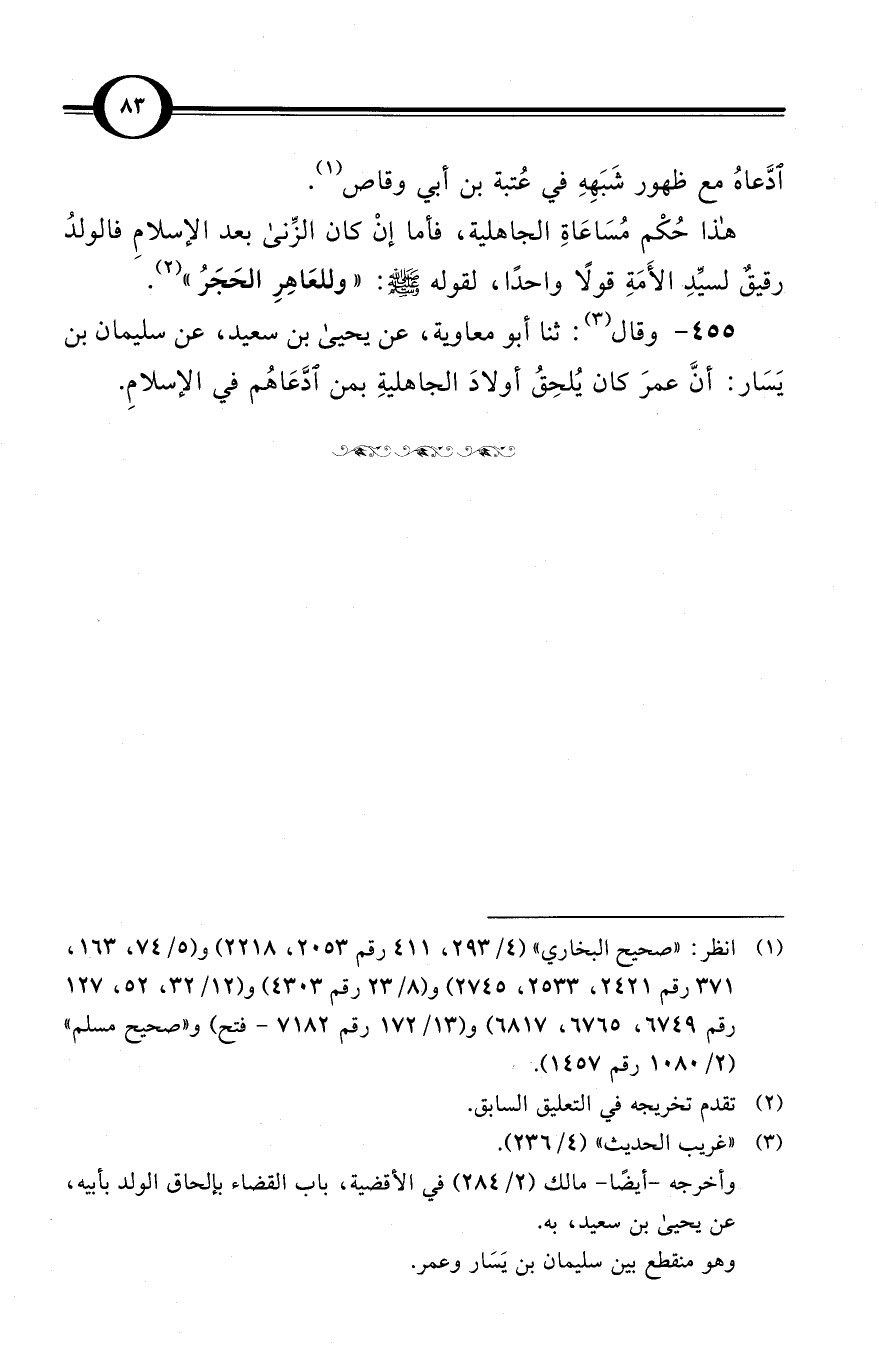 (455) وقال (¬3): ثنا أبو معاوية، عن يحيى بن سعيد، عن سليمان بن يَسَار: أنَّ عمرَ كان يُلحِقُ أولادَ الجاهليةِ بمن ادَّعَاهُم في الإسلامِ.