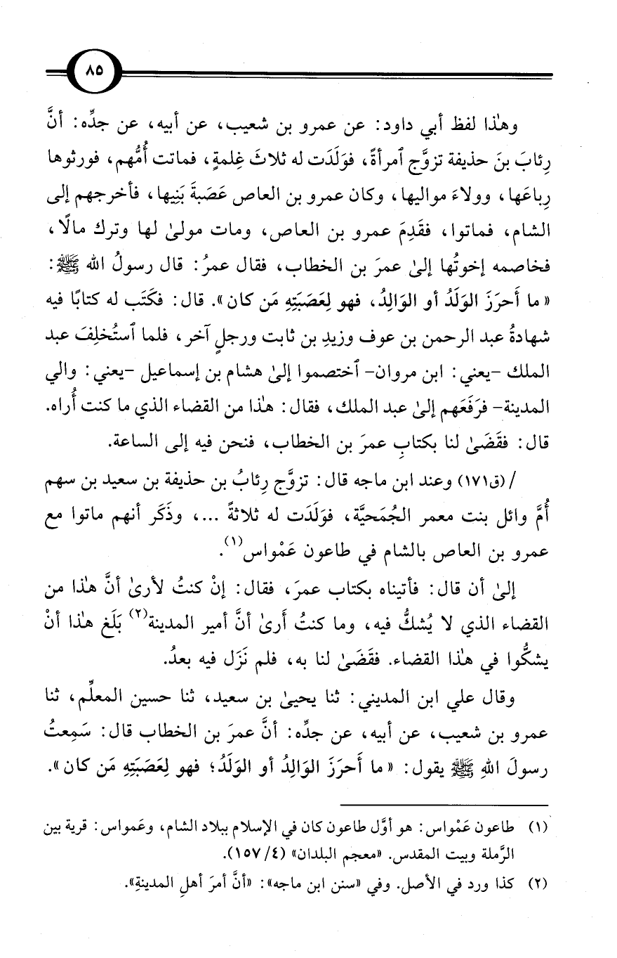 وهذا لفظ أبي داود: عن عمرو بن شعيب، عن أبيه، عن جدِّه: أنَّ رِئابَ بنَ حذيفة تزوَّج امرأةً، فوَلَدَت له ثلاثَ غِلمةٍ، فماتت أُمُّهم، فورثوها رِباعَها، وولاءَ مواليها، وكان عمرو بن العاص عَصَبةَ بَنِيها، فأخرجهم إلى الشام، فماتوا، فقَدِمَ عمرو بن العاص، ومات مولىً لها وترك مالاً، فخاصمه إخوتُها إلى عمرَ بن الخطاب، فقال عمرُ: قال رسولُ الله صلى الله عليه وسلم: «ما أَحرَزَ الوَلَدُ أو الوَالِدُ، فهو لِعَصَبَتِهِ مَن كان». قال: فكَتَب له كتابًا فيه شهادةُ عبد الرحمن بن عوف وزيدِ بن ثابت ورجلٍ آخر، فلما استُخلِفَ عبد الملك -يعني: ابن مروان- اختصموا إلى هشام بن إسماعيل -يعني: والي المدينة- فرَفَعَهم إلى عبد الملك، فقال: هذا من القضاء الذي ما كنت أُراه. قال: فقَضَى لنا بكتابِ عمرَ بن الخطاب، فنحن فيه إلى الساعة.