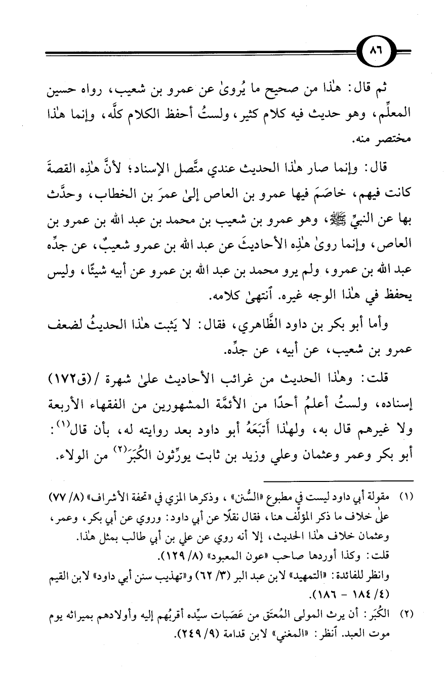 وأما أبو بكر بن داود الظَّاهري، فقال: لا يَثبت هذا الحديثُ لضعف عمرو بن شعيب، عن أبيه، عن جدِّه.