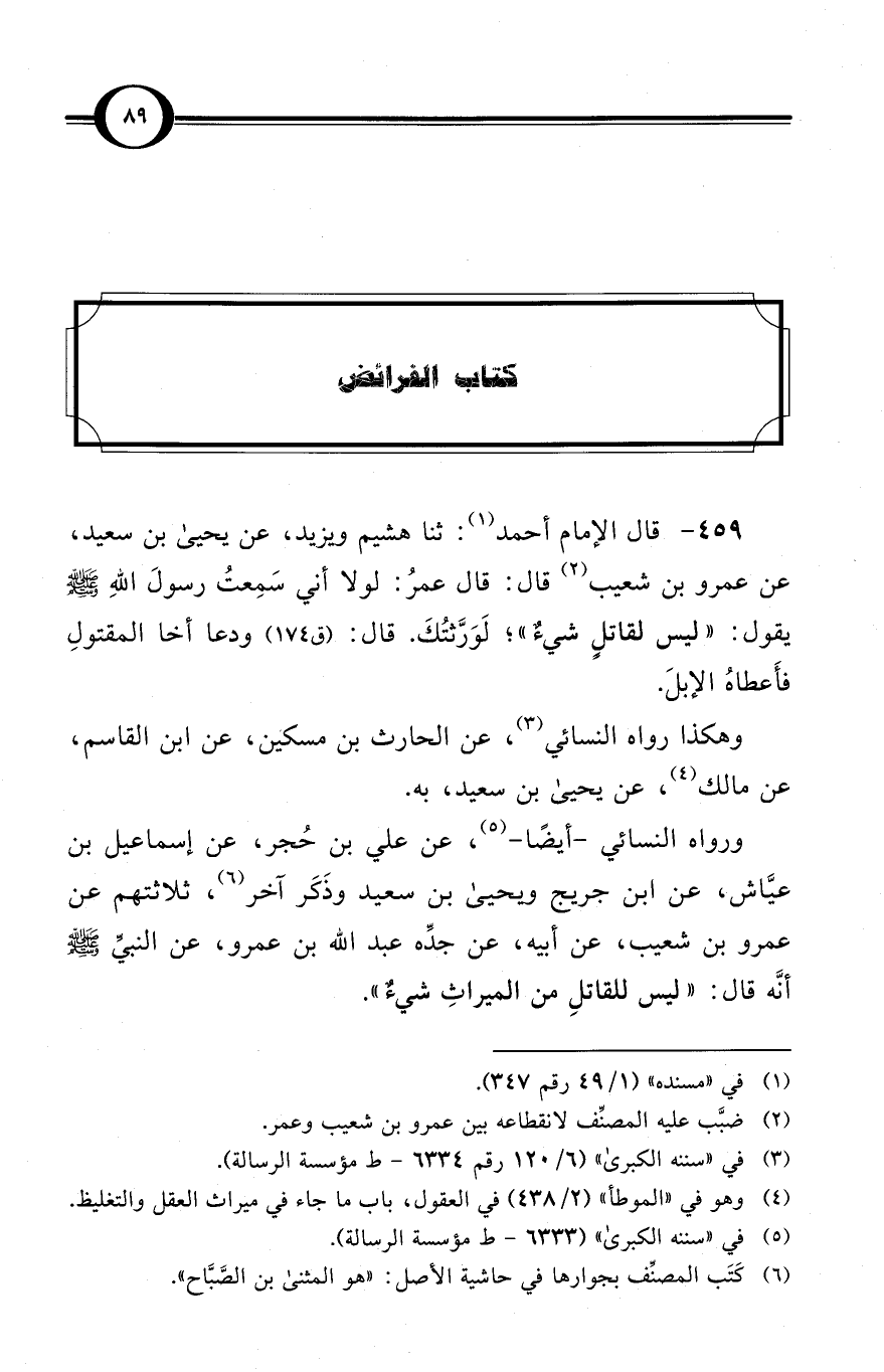 (459) قال الإمام أحمد (¬1): ثنا هشيم ويزيد، عن يحيى بن سعيد، عن عمرو بن شعيب (¬2) قال: قال عمرُ: لولا أني سَمِعتُ رسولَ اللهِ صلى الله عليه وسلم يقول: «ليس لقاتلٍ شيءٌ»؛ لَوَرَّثتُكَ. قال: / (ق 174) ودعا أخا المقتولِ فأَعطاهُ الإبلَ.
