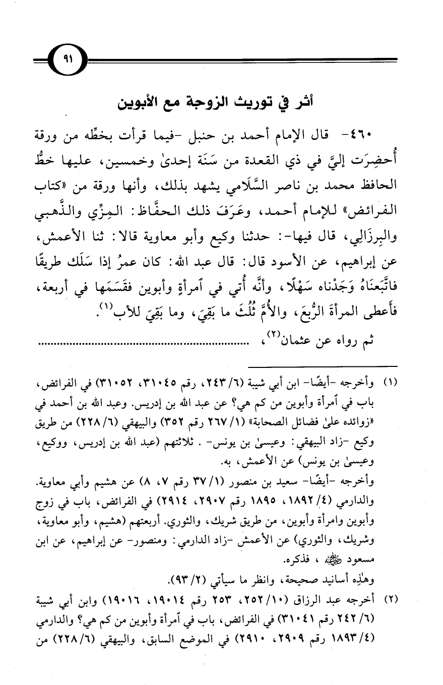 (460) قال الإمام أحمد بن حنبل -فيما قرأت بخطِّه من ورقة أُحضِرَت إليَّ في ذي القعدة من سَنَة إحدى وخمسين، عليها خطُّ الحافظ محمد بن ناصر السَّلاَمي يشهد بذلك، وأنها ورقة من «كتاب الفرائض» للإمام أحمد، وعَرَفَ ذلك الحفَّاظ: المِزِّي والذَّهبي والبِرزَالِي، قال فيها-: حدثنا وكيع وأبو معاوية قالا: ثنا الأعمش، عن إبراهيم، عن الأسود قال: قال عبد الله: كان عمرُ إذا سَلَك طريقًا فاتَّبَعنَاهُ وَجَدْناه سَهْلاً، وأنَّه أُتي في امرأةٍ وأبوين فقَسَمَها في أربعة، فأَعطى المرأةَ الرُّبعَ، والأُمَّ ثُلُثَ ما بَقِيَ، وما بَقِيَ للأب (¬1).