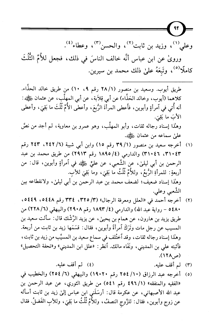 (¬1) أخرجه سعيد بن منصور (1/ 39 رقم 15) وابن أبي شيبة (6/ 242، 243 رقم 31043، 31046) والدارمي (4/ 1895 رقم 2913) من طريق محمد بن عبد الرحمن بن أبي ليلى، عن الشَّعبي، عن عليٍّ -رضي الله عنه- في امرأةٍ وأبوين، قال: من أربعةٍ: للمرأةِ الرُّبعُ، وللأُمِّ ثُلُثُ ما بَقِيَ، وما بَقِيَ للأبِ.